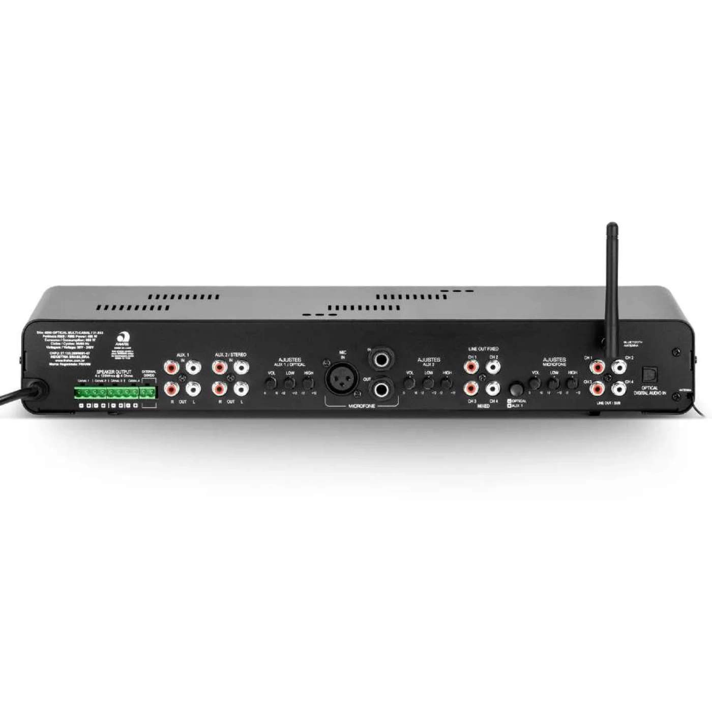 O amplificador Slim 4500 Optical Multi-channel da Frahm possui 4×120 Watts RMS (4 Ohms) de potência e é ideal para grandes ambientes (projetos com até 60 caixas ou arandelas (15 por canal) com 8 ohms cada e ambientes com mais de 300 m²).