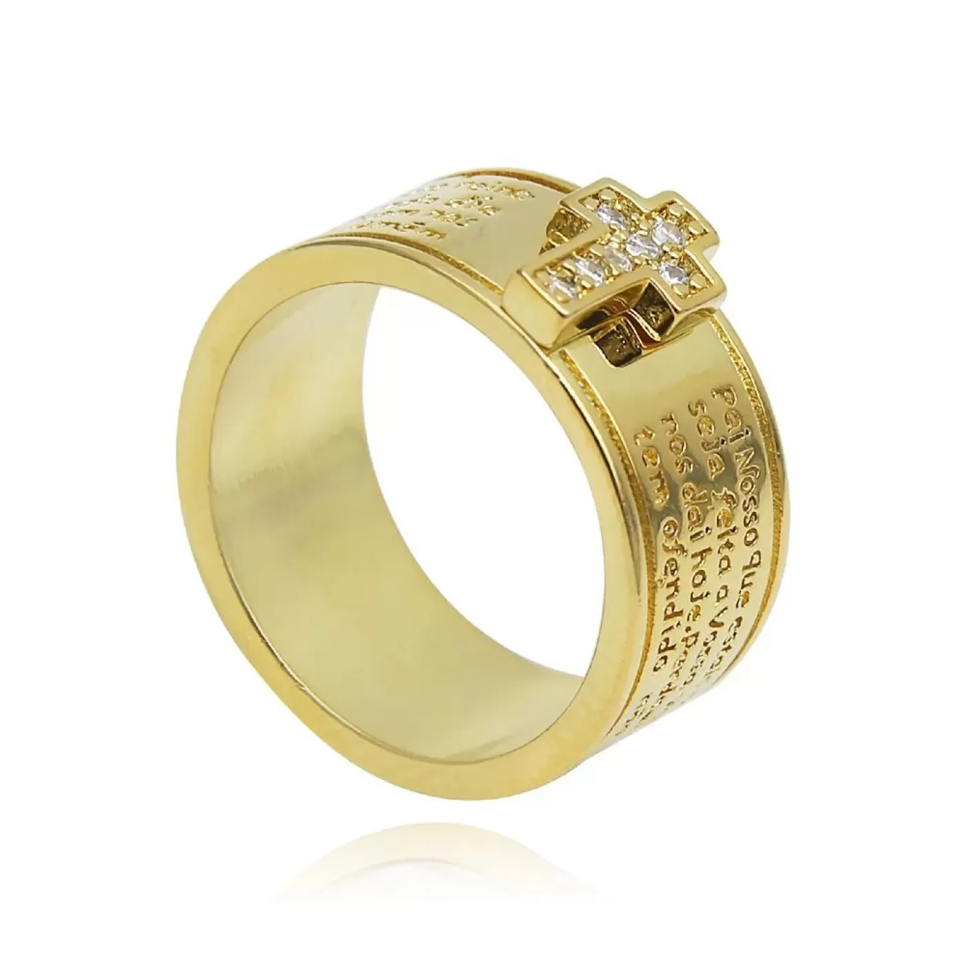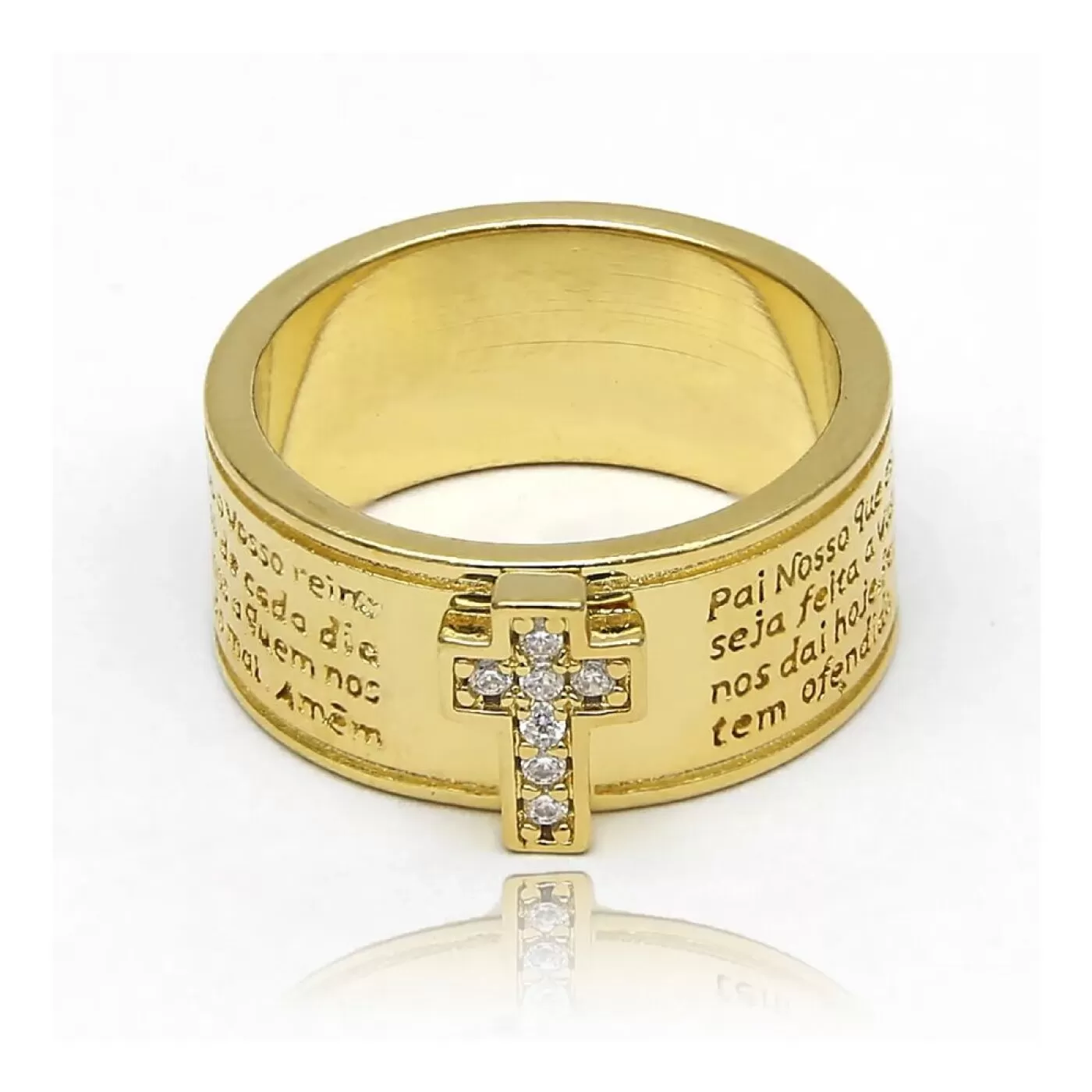 Feito em zircônia dourada, um material que confere brilho e durabilidade, este anel possui uma cruz delicadamente detalhada em seu centro, simbolizando a fé cristã. Além disso, sua característica mais marcante é a inscrição do Pai Nosso ao redor da circunferência do anel, proporcionando uma conexão direta com uma das mais conhecidas e reverenciadas orações do cristianismo.