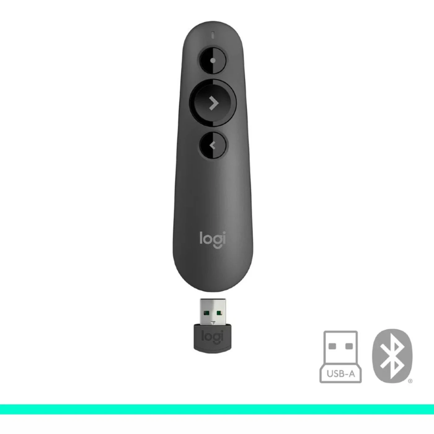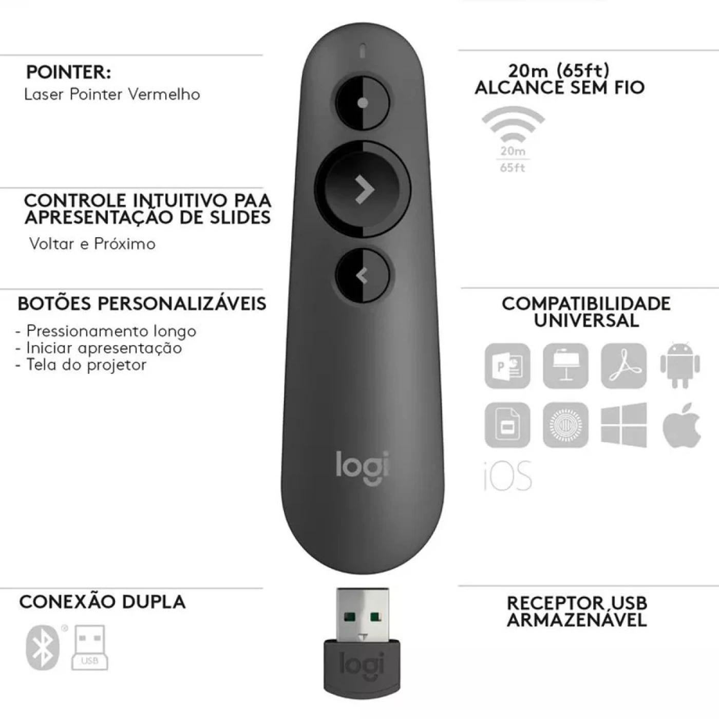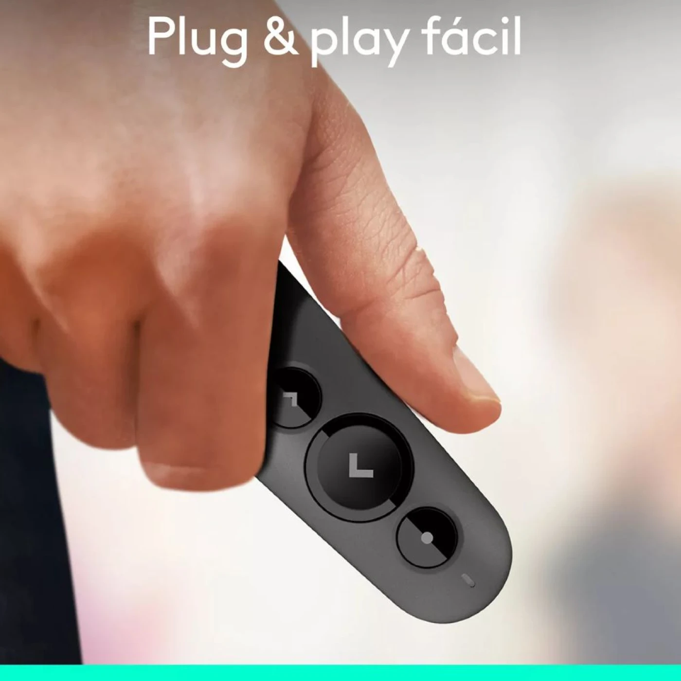 O R500s é um controle remoto plug-and-play para apresentações que permite navegar pelos slides e usar o ponteiro a laser a uma distância de até 20 metros.