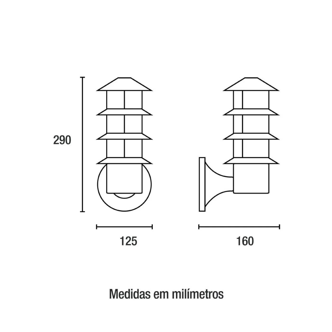 Resistente contra intempéries do tempo com Índice de Proteção 43 (IP43), conta com corpo em alumínio injetado, lente de acrílico leitoso, soquete E27.