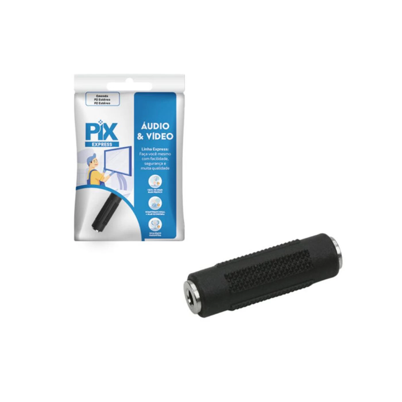 A Emenda P2 Estéreo / P2 Estéreo 033-0001HC PIX é um acessório utilizado para unir dois cabos P2 estéreo, permitindo a transmissão de áudio em alta qualidade entre dispositivos como smartphones, tablets, computadores, entre outros.