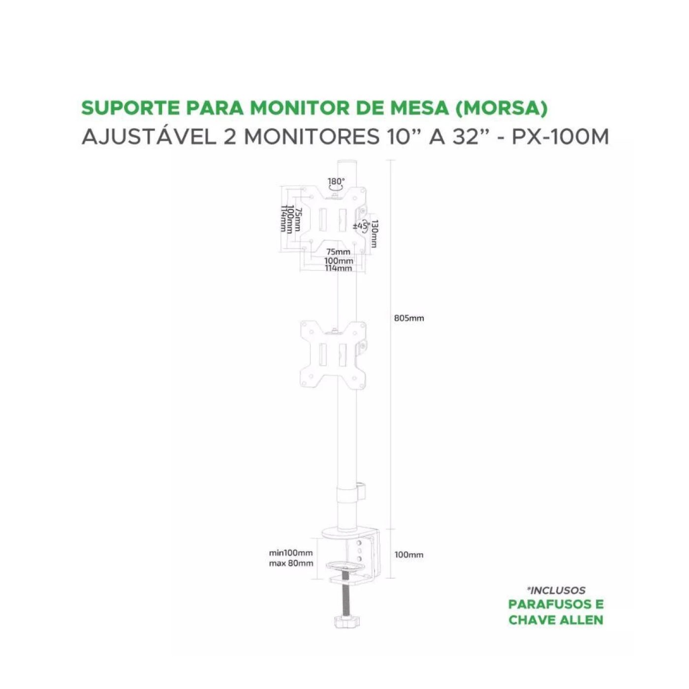 O suporte ajustável de mesa PIX PX-100M é ideal para organizar seu espaço de trabalho, oferecendo suporte seguro e eficiente para dois monitores de tamanhos entre 10 e 32 polegadas.