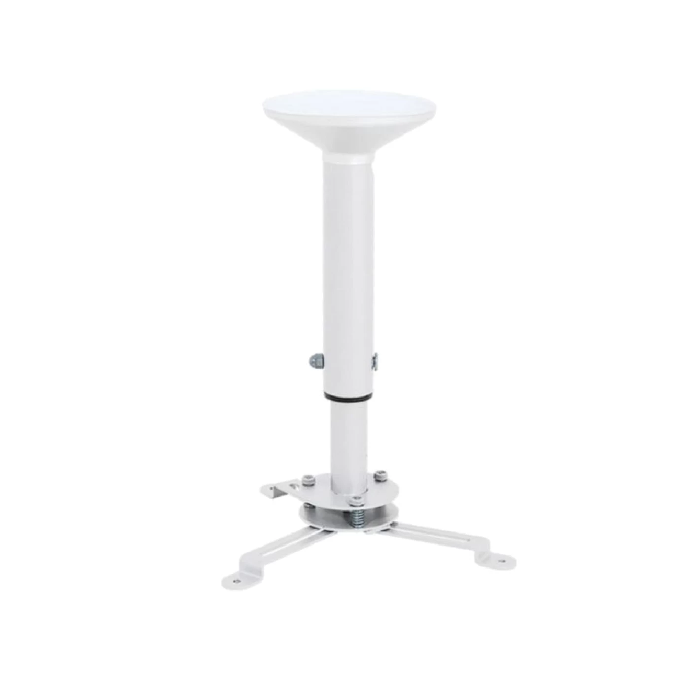 Sobre o produto: Suporte de teto para Projetor com regulagem de altura de 30,0 até 50,0cm. Possui sistema de fixação Universal sendo compatível com os projetores do mercado que possuem ao menos 3 pontos para fixação. O seu conjunto de molas permite que o ajuste da inclinação seja milimétrico. Junto com o suporte vem uma capa decorativa para a base que esconde os parafusos quando instalada na laje ou faz o acabamento do forro. A passagem dos cabos pode ser feita por dentro dos tubos do suporte garantindo uma instalação perfeita.