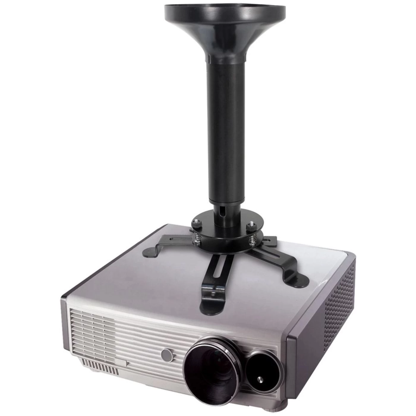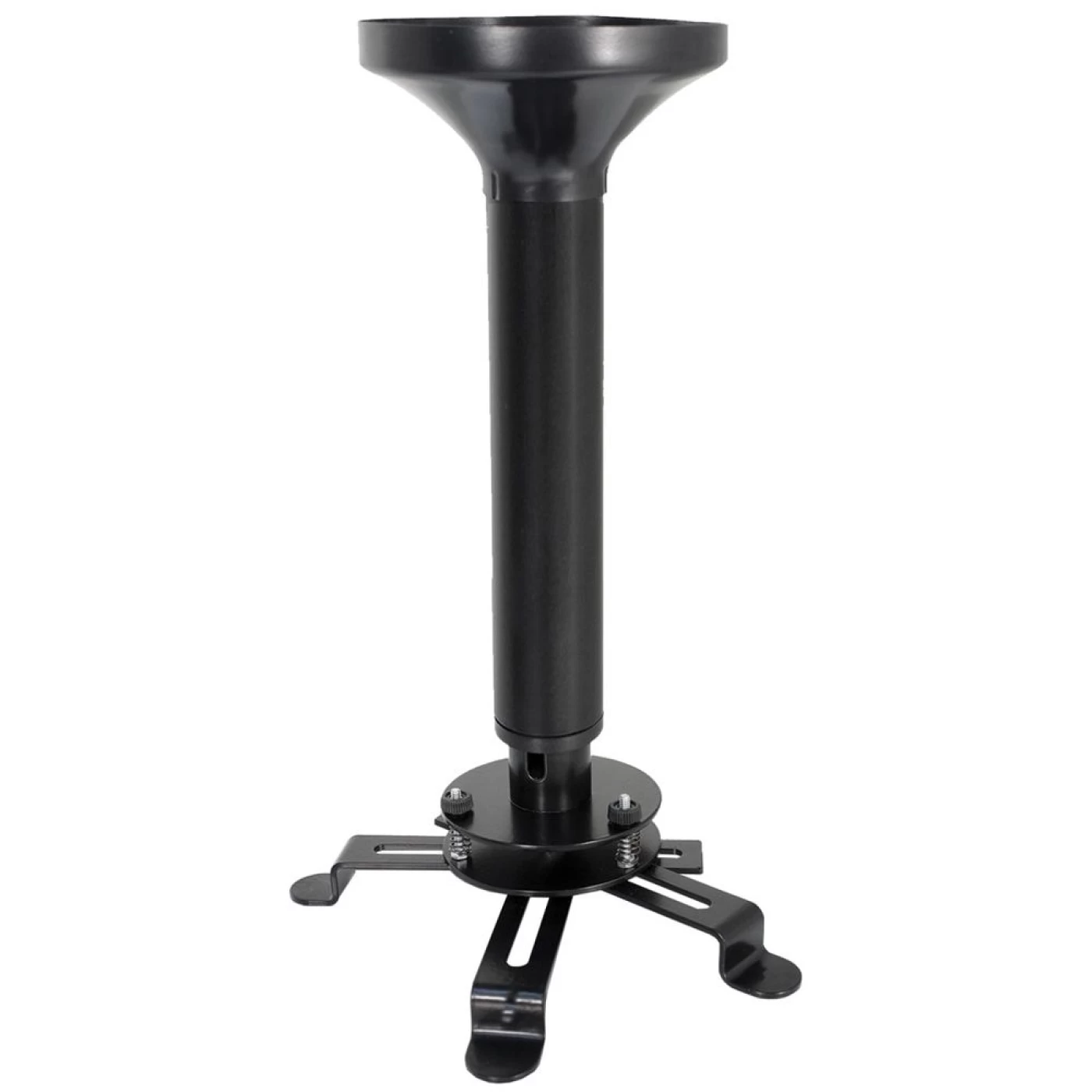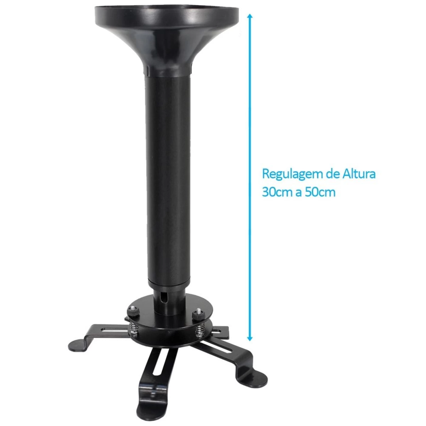 Sobre o produto: Suporte de teto para Projetor com regulagem de altura de 30,0 até 50,0cm. Possui sistema de fixação Universal sendo compatível com os projetores do mercado que possuem ao menos 3 pontos para fixação. O seu conjunto de molas permite que o ajuste da inclinação seja milimétrico. Junto com o suporte vem uma capa decorativa para a base que esconde os parafusos quando instalada na laje ou faz o acabamento do forro. A passagem dos cabos pode ser feita por dentro dos tubos do suporte garantindo uma instalação perfeita.
