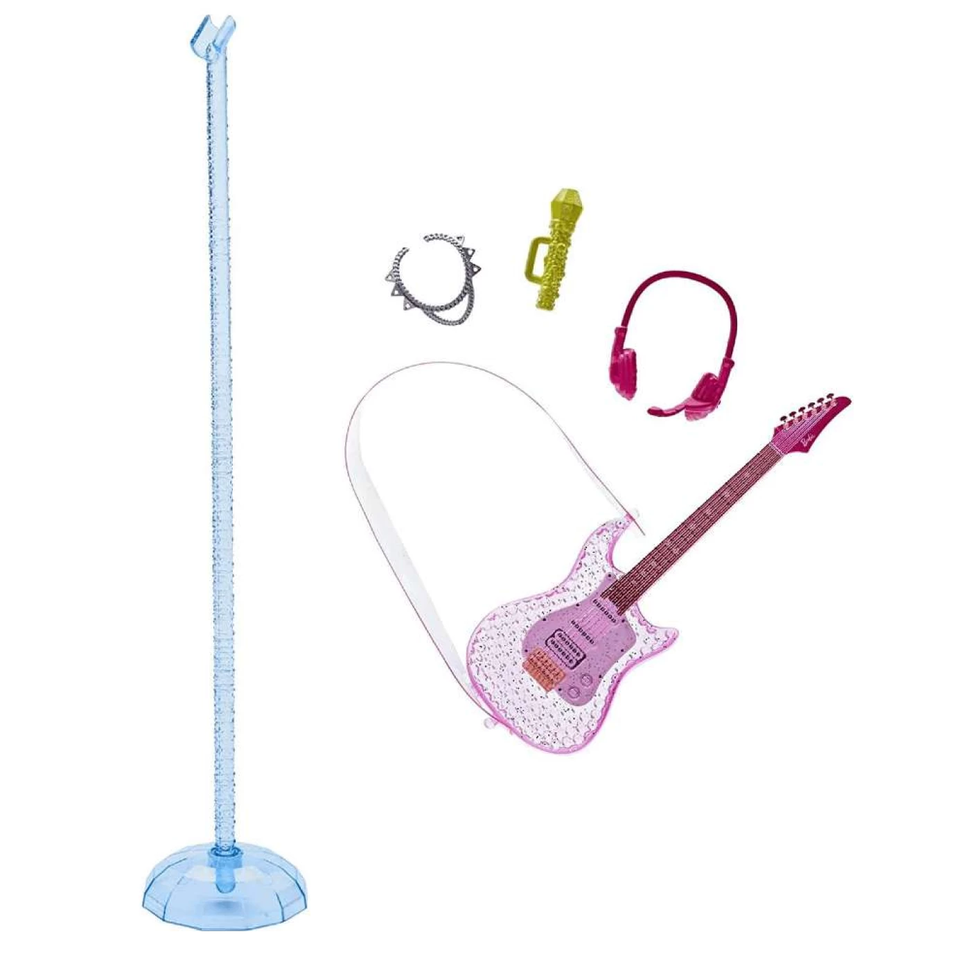 Faça momentos incríveis no palco com a boneca Barbie cantora! Quando as crianças levam o microfone da boneca Barbie à boca, a música toca, seu vestido se ilumina e ela cantará junto com uma das duas canções originais! Quando seu braço está de volta no lugar, a música continua tocando, mas a boneca Barbie para de cantar até que as crianças levantem o microfone novamente. A boneca Barbie usa vestido, colar e sapatos brilhantes. Ajude-a a se divertir com acessórios, incluindo guitarra, fone de ouvido, microfone com pedestal e muito mais!