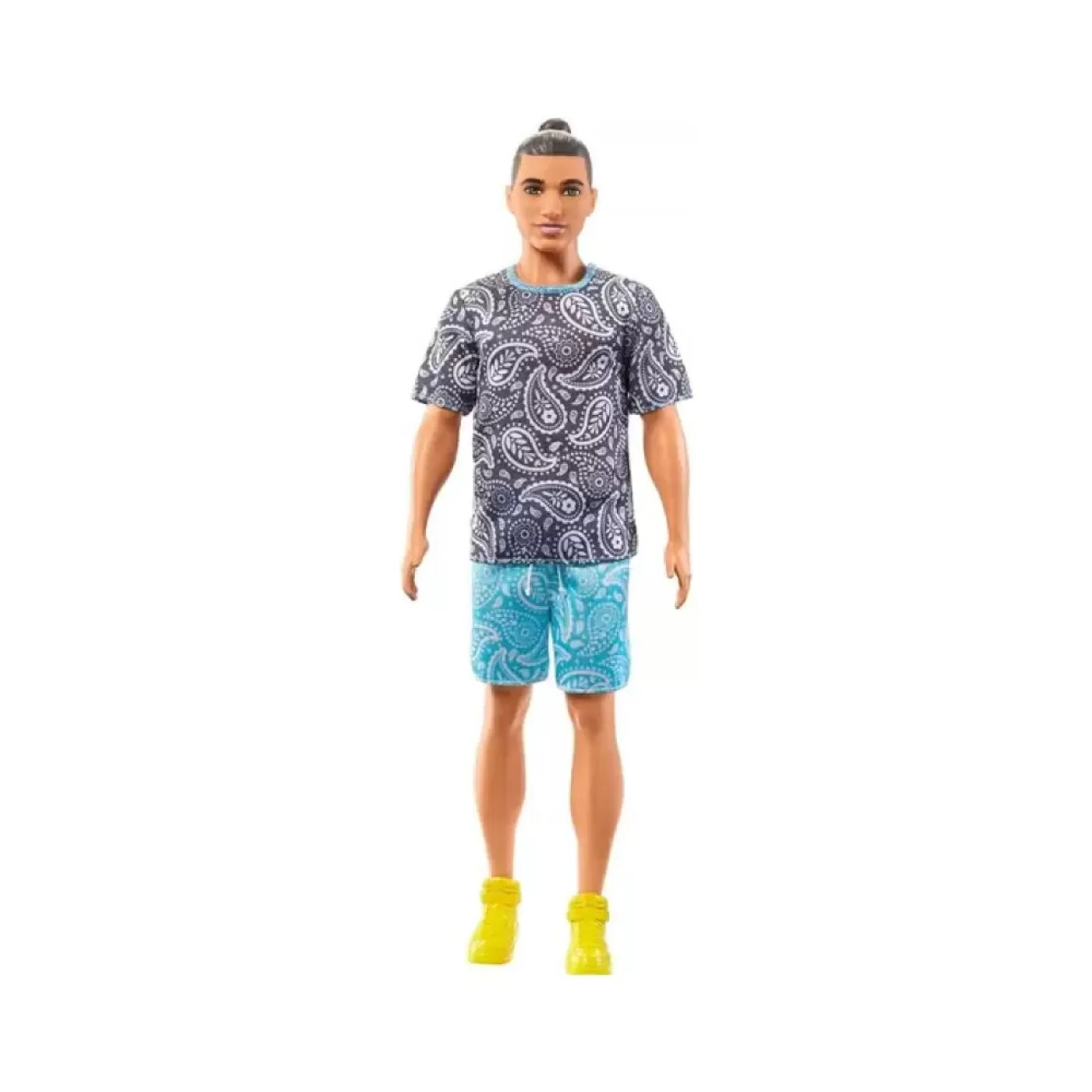 O boneco Ken tem um corpo largo e cabelos castanhos em um coque, sua camiseta cinza e shorts azul aqua ostentam uma estampa paisley para um visual divertido.