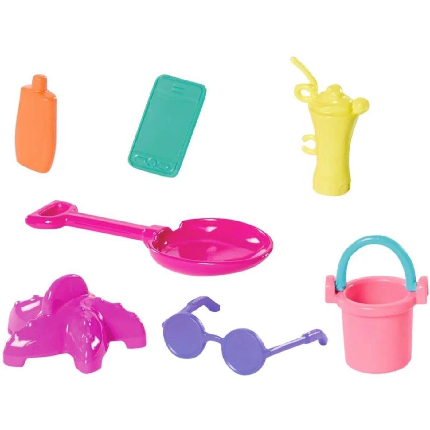 Com os 10 itens ( 1Guarda-sol, 1 cadeira espreguiçadeira, 1 toalha de praia, 1 óculos de sol, 1 celular, 1 protetor solar, 1 copo de suco, 1 balde, 1 pá e 1 estela do mar) fazem a imersão ser muito maior para a criançada que adora se divertir ao lado da Barbie.