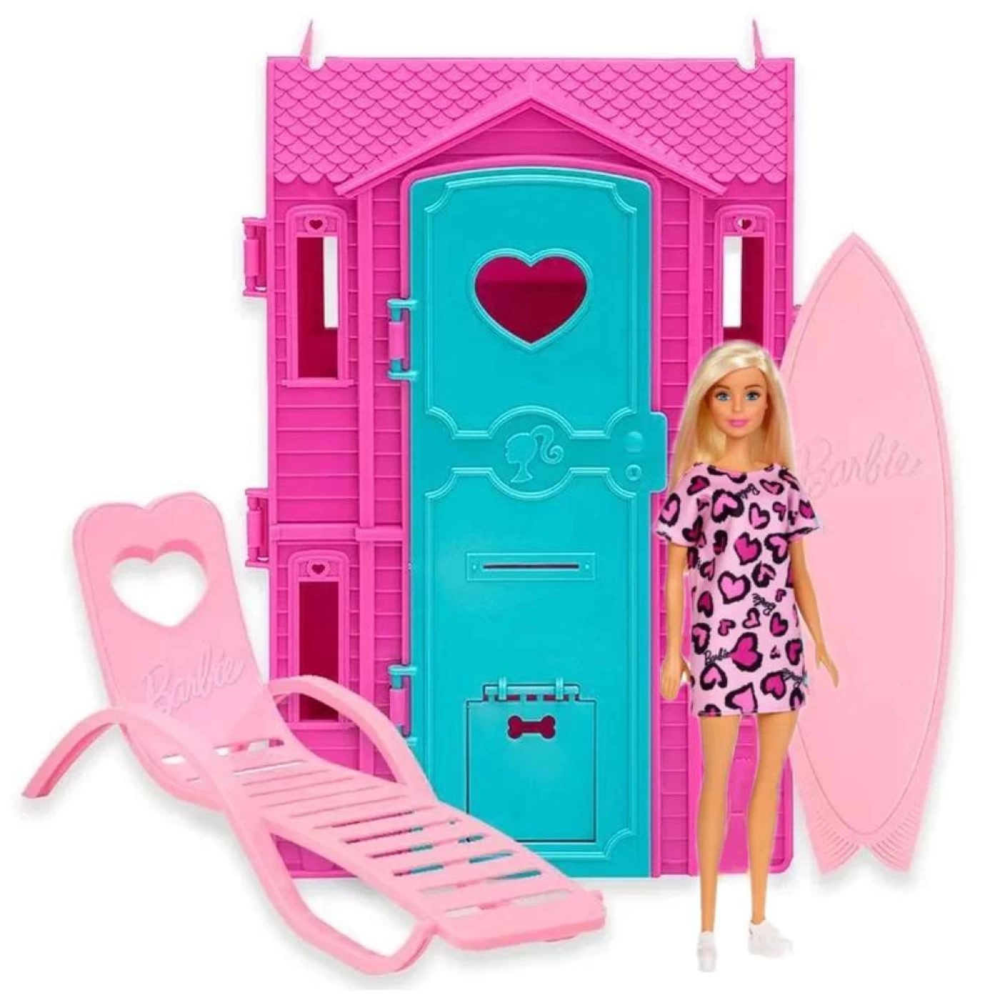 As meninas vão adorar se divertir e participar de altas aventuras com a Barbie Studio de Surf da Fun. O tempo está muito bom. Muito sol e, quando isso acontece, a Barbie adora pegar uma onda com as suas amigas. Agora, você também pode fazer parte dessa brincadeira com esse lindo studio de surf da barbie. O estúdio para a Barbie colocar a sua roupa de praia e surfar nas ondas da diversão. O Studio de Surf vem com 1 casa com porta, 1 espreguiçadeira de praia, 1 prancha de surf e 1 boneca Barbie para você se divertir de montão.