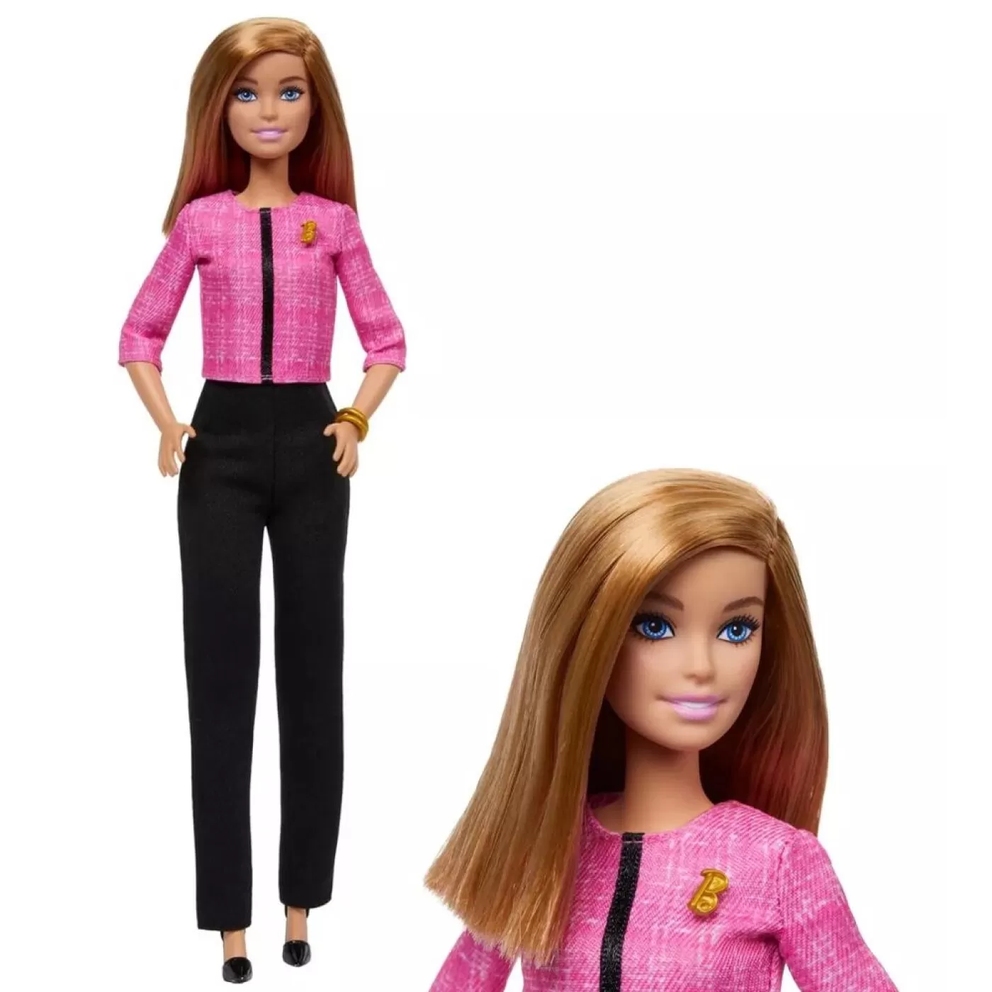 A boneca Barbie está pronta para assumir a liderança em um look de blazer rosa e saia ou calça, combinando com duas pulseiras douradas e um broche "B"!