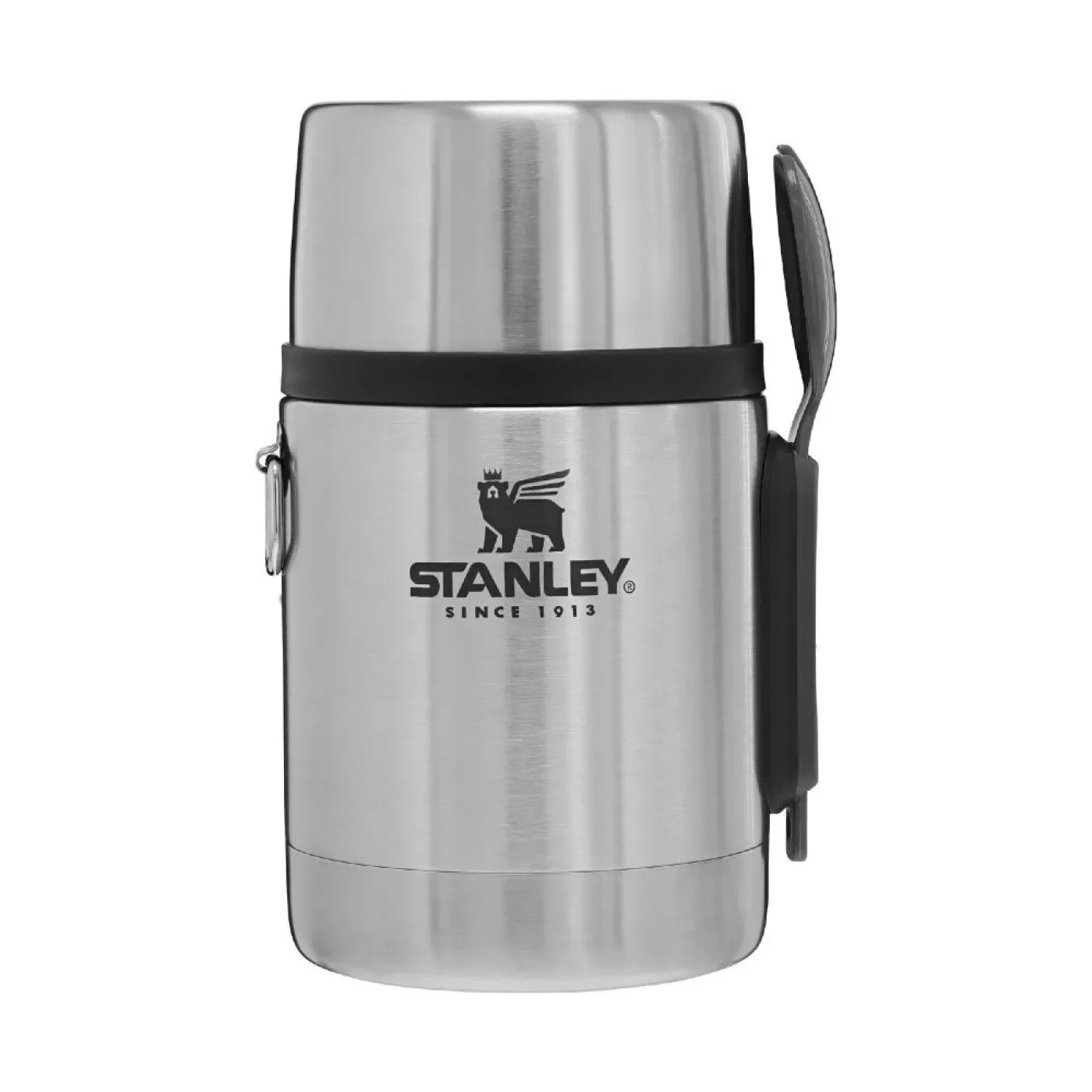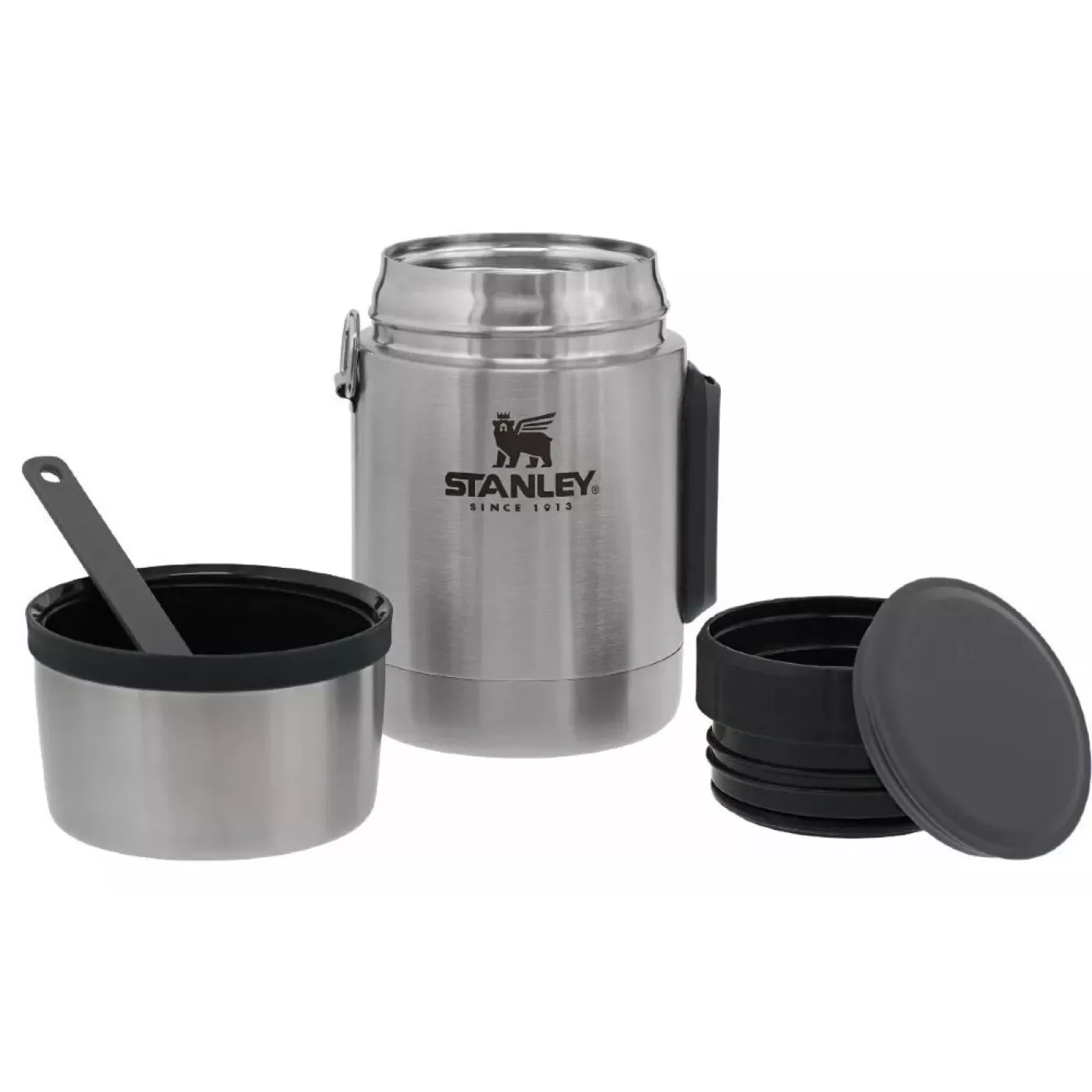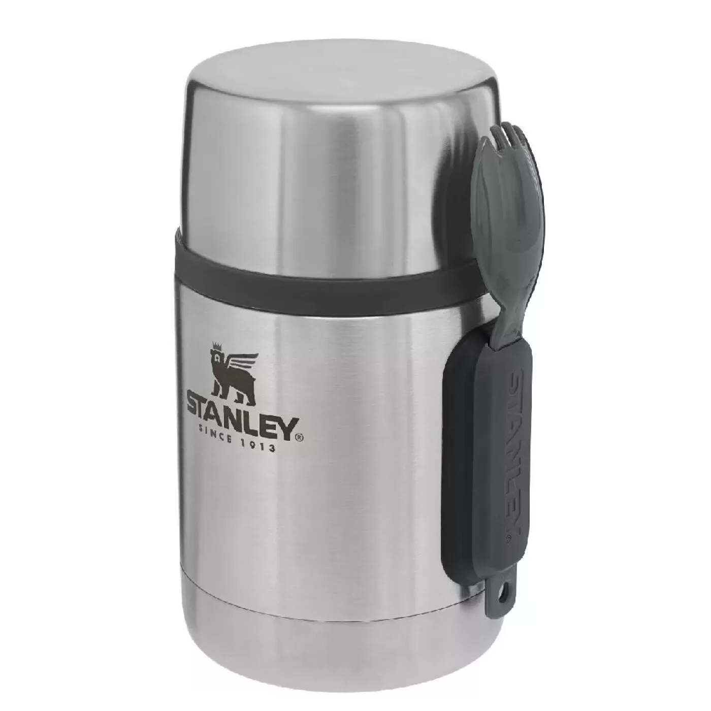 O Pote Térmico Stanley para alimentos possui parede dupla isolada a vácuo, mantendo a temperatura por até 12 horas. É ideal para refeições ao ar livre. Conta com um compartimento para ingredientes secos, como temperos, e inclui o utensílio multifuncional "garfolher".