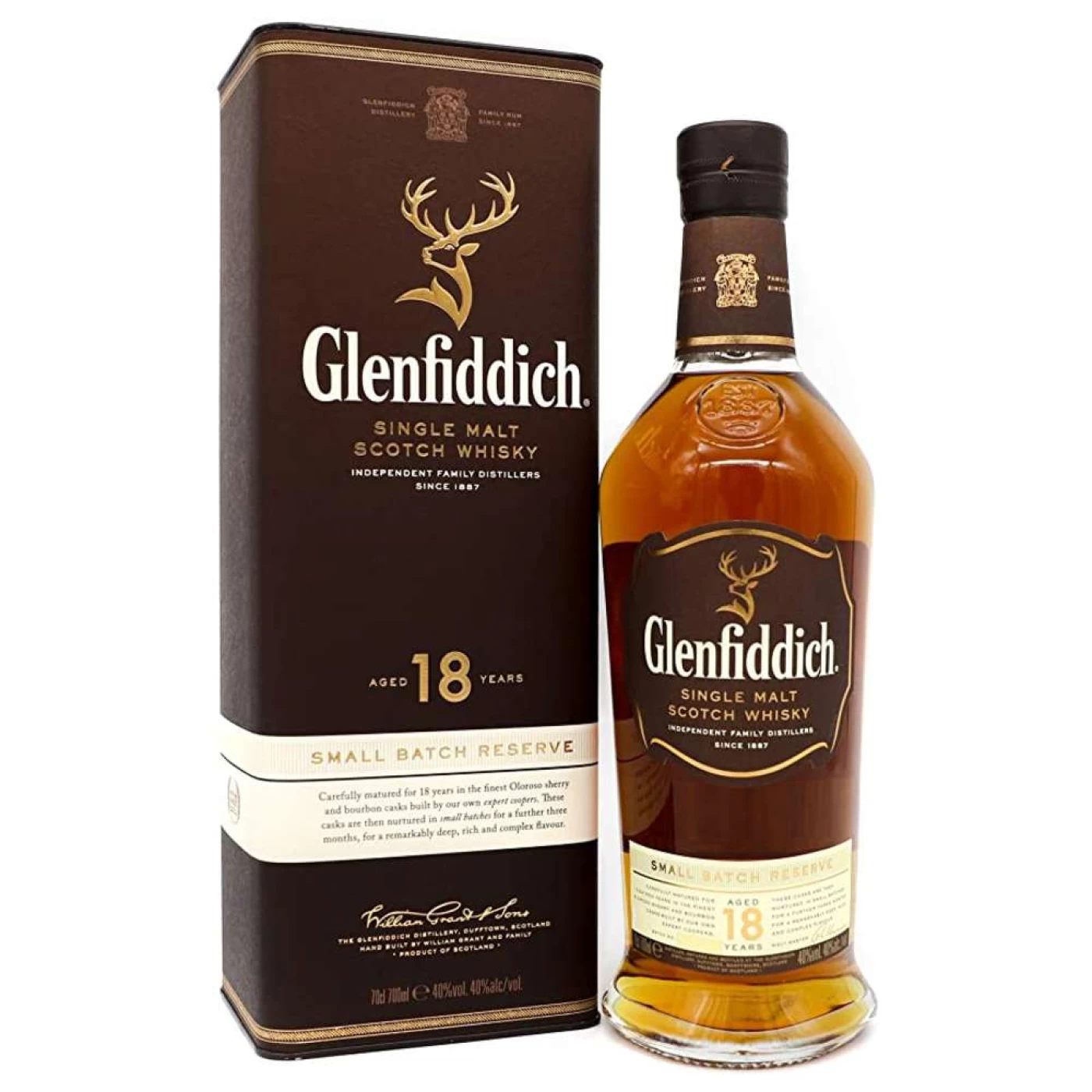 Produzido em pequenos lotes numerados individualmente, o Glenfiddich single malt Scotch whisky de 18 anos combina o toque adocicado e frutado da madeira espanhola Oloroso com o carvalho dos barris tradicionais americanos. Depois de combinados em tonéis de madeira, onde permanecem por pelo menos 3 meses, seus ricos sabores se unem, criando um excepcionalmente suave e marcadamente profundo single malt escocês com notas de maçã caramelada e madeira.