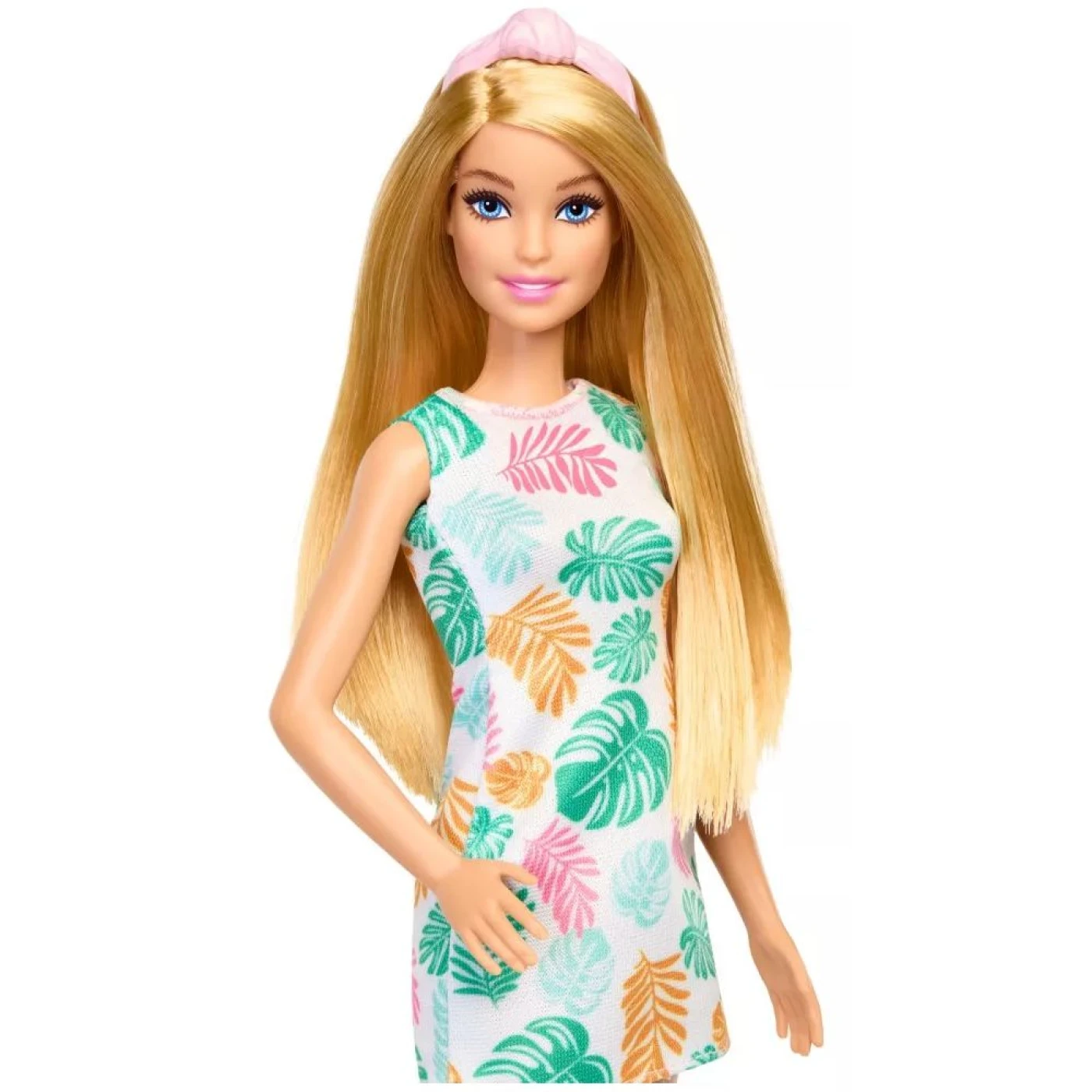 A Barbie tem cabelo loiro e comprido com uma tiara rosa e usa um vestido com estampa de folhas com botas cor-de-rosa! Ela vem com um gatinho fofo que adora participar da diversão.