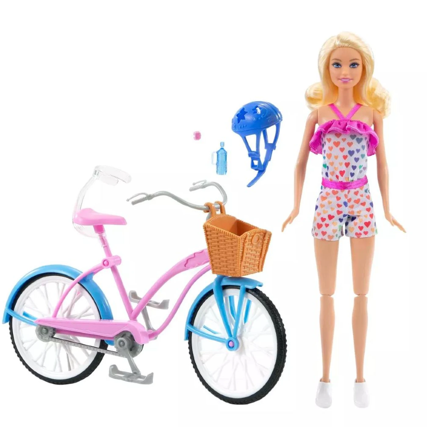 A bicicleta é rosa e azul e tem características realistas, como detalhes prateados e cesto que tornam o visual perfeito para a boneca Barbie.