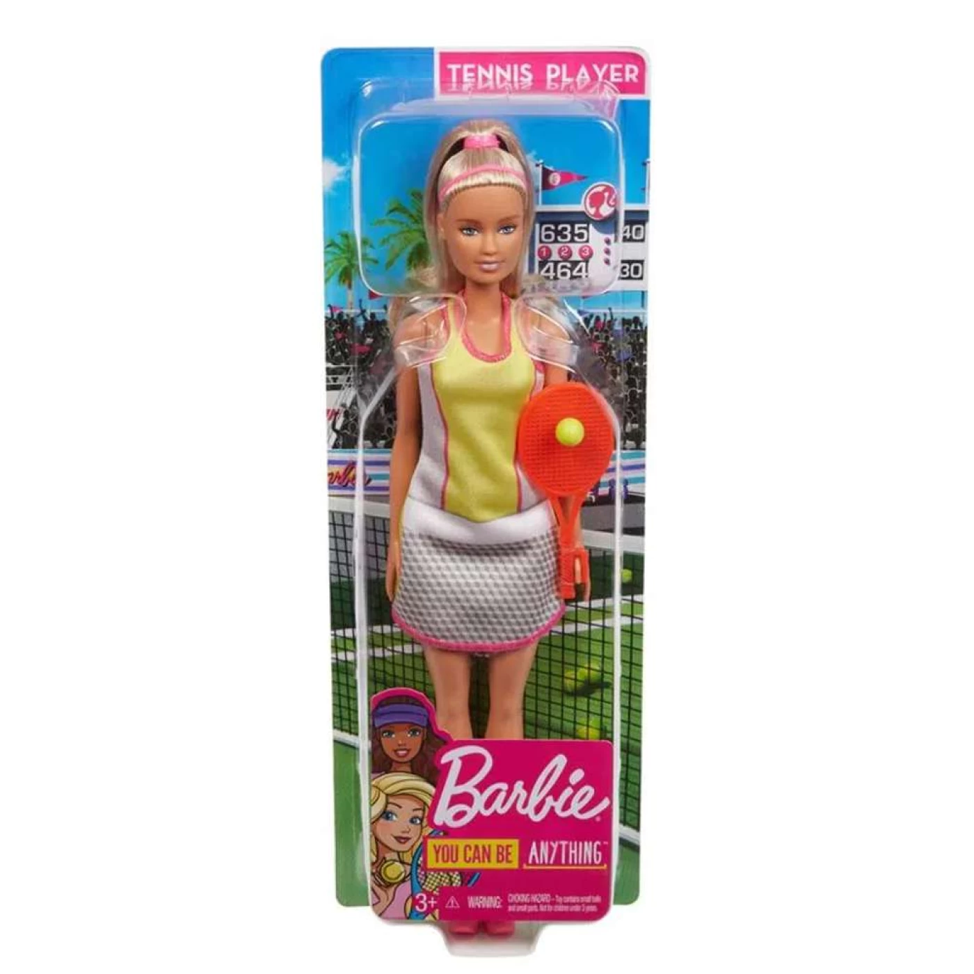 As bonecas Barbie Profissões inspiram as crianças a sonhar alto! Cada boneca pode atingir seus objetivos vestindo uma roupa certa com o tema da carreira, juntamente com acessórios. A boneca tenista está pronta para a quadra em uma roupa que a ajudará a ter destaque, um conjunto discreto e elegante, uma saia com estilo quadriculado, tênis rosa da moda e longos cabelos loiro, mostrará sua performance com sua raquete. A boneca tenista da Barbie é um presente perfeito para jovens amantes do esporte.