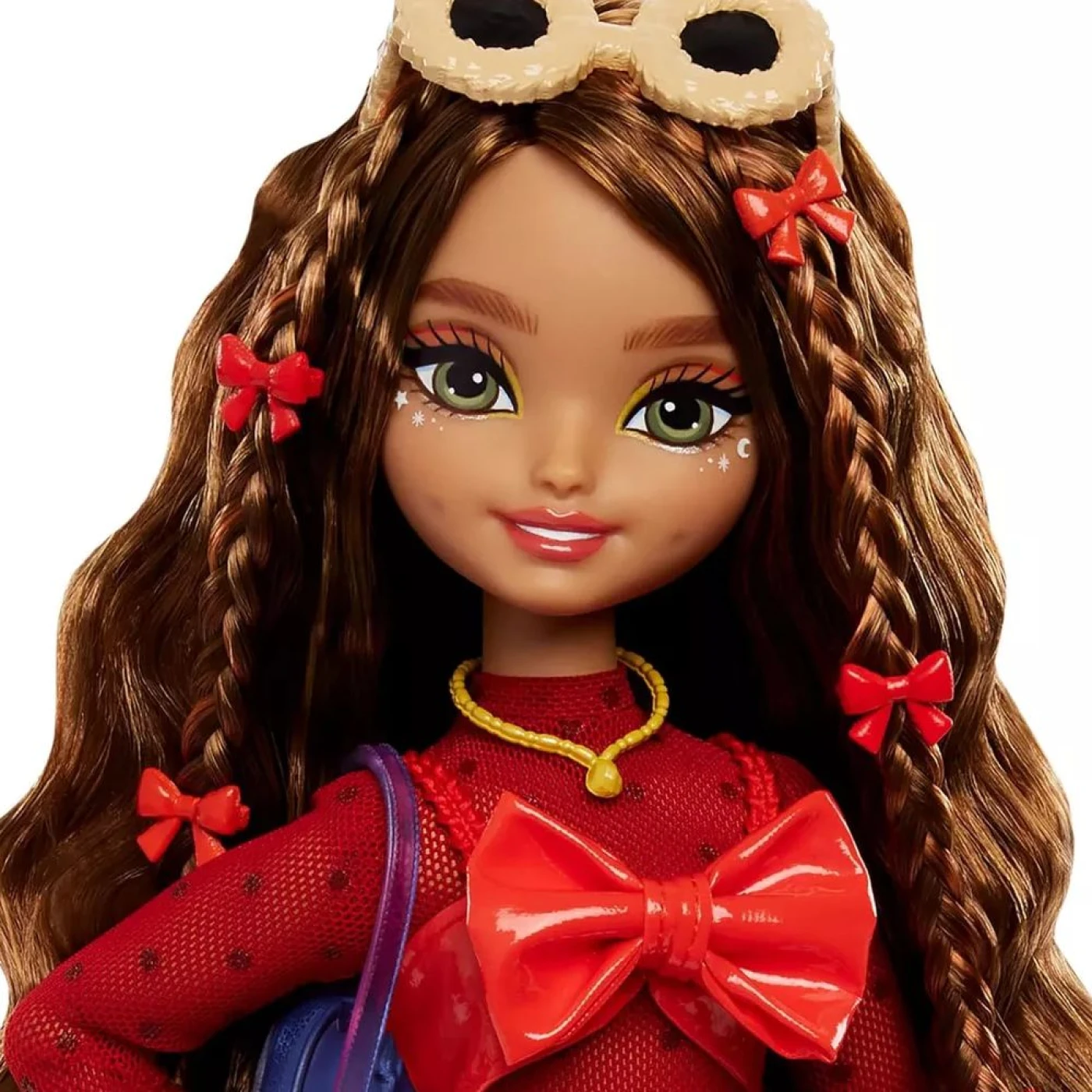 A boneca é ajustável e usa Fashions removíveis, como um top de bolinhas com um laço vermelho brilhante, shorts que combinam com o top e saltos altos.