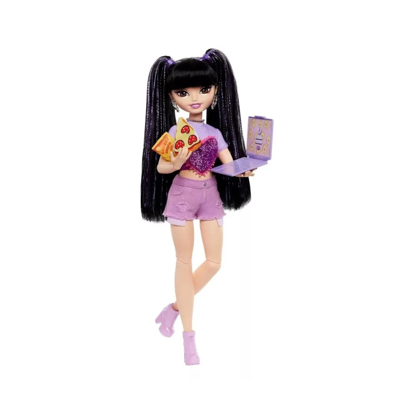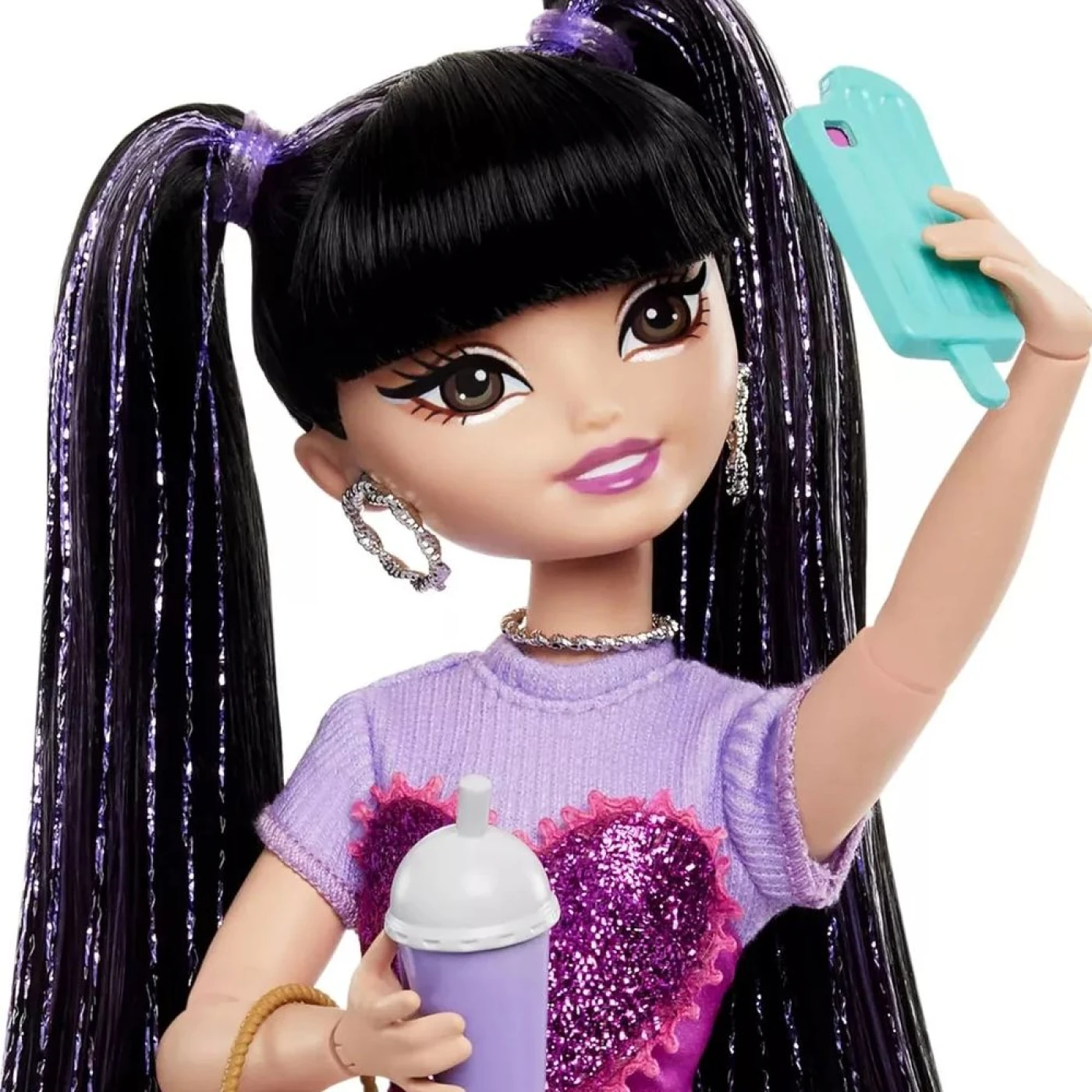 A boneca Renee tem cabelo preto comprido, penteado em tranças, com mechas roxas brilhantes para mostrar sua personalidade animada!