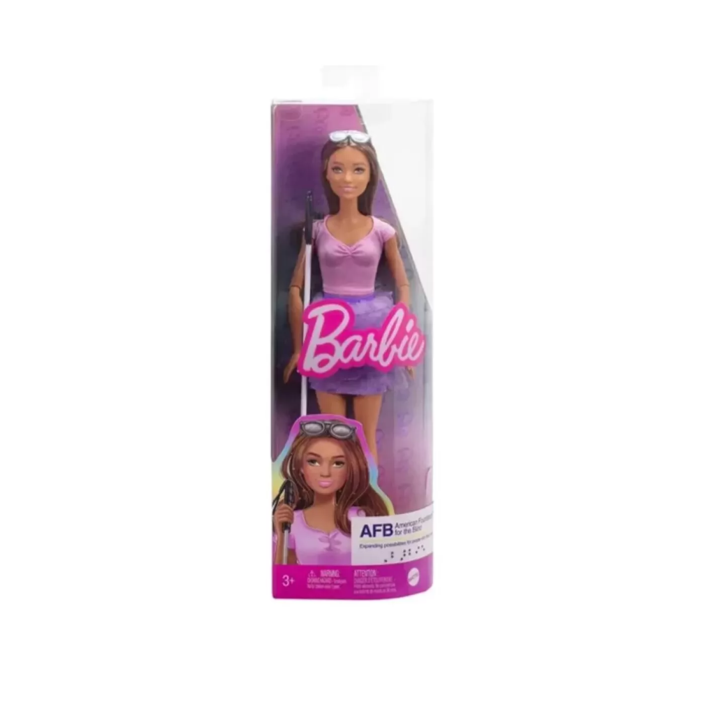 Apresentando a primeira boneca Barbie Fashionistas cega! A Barbie fez uma parceria com a American Foundation for the Blind para projetar uma boneca que retrata com precisão alguém que é cego ou tem baixa visão.