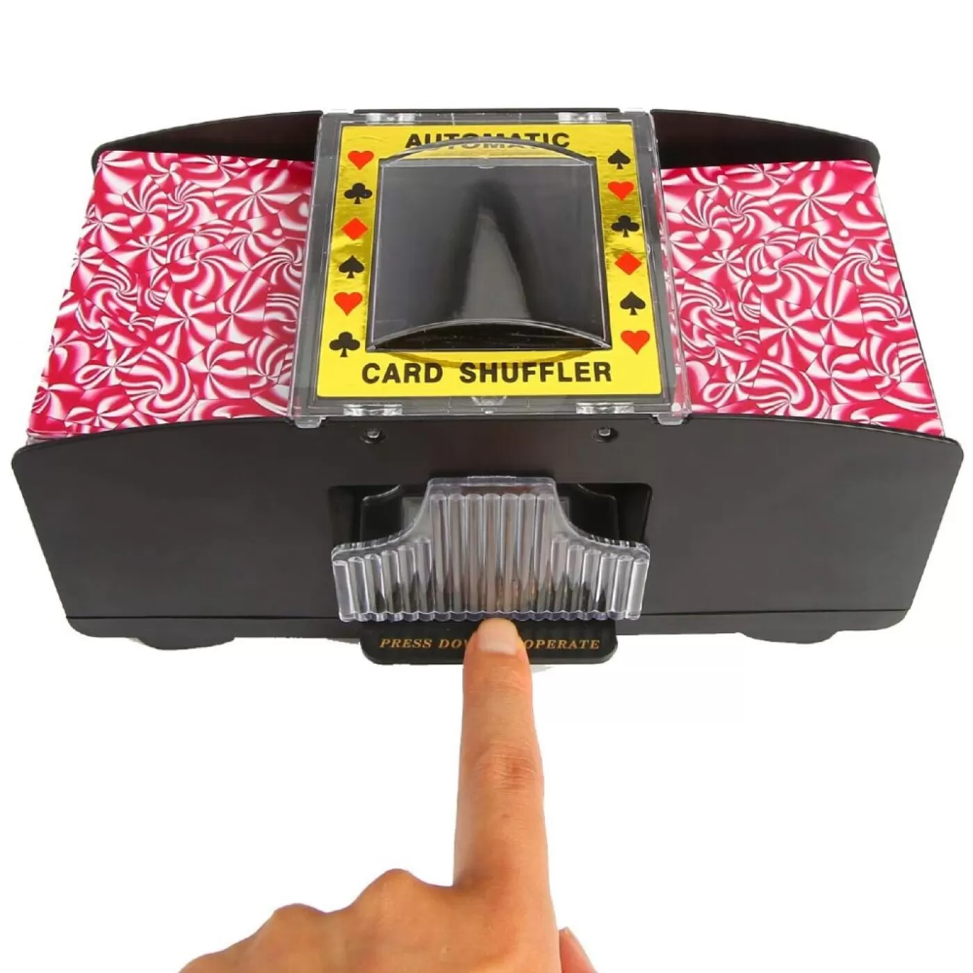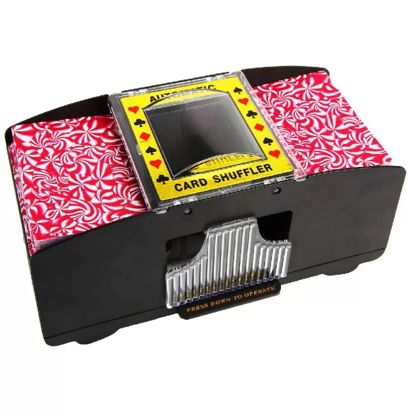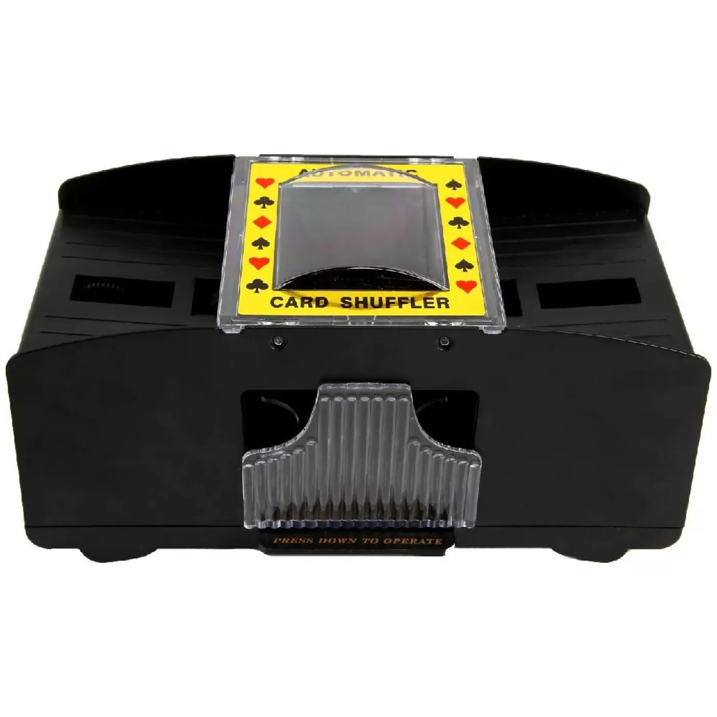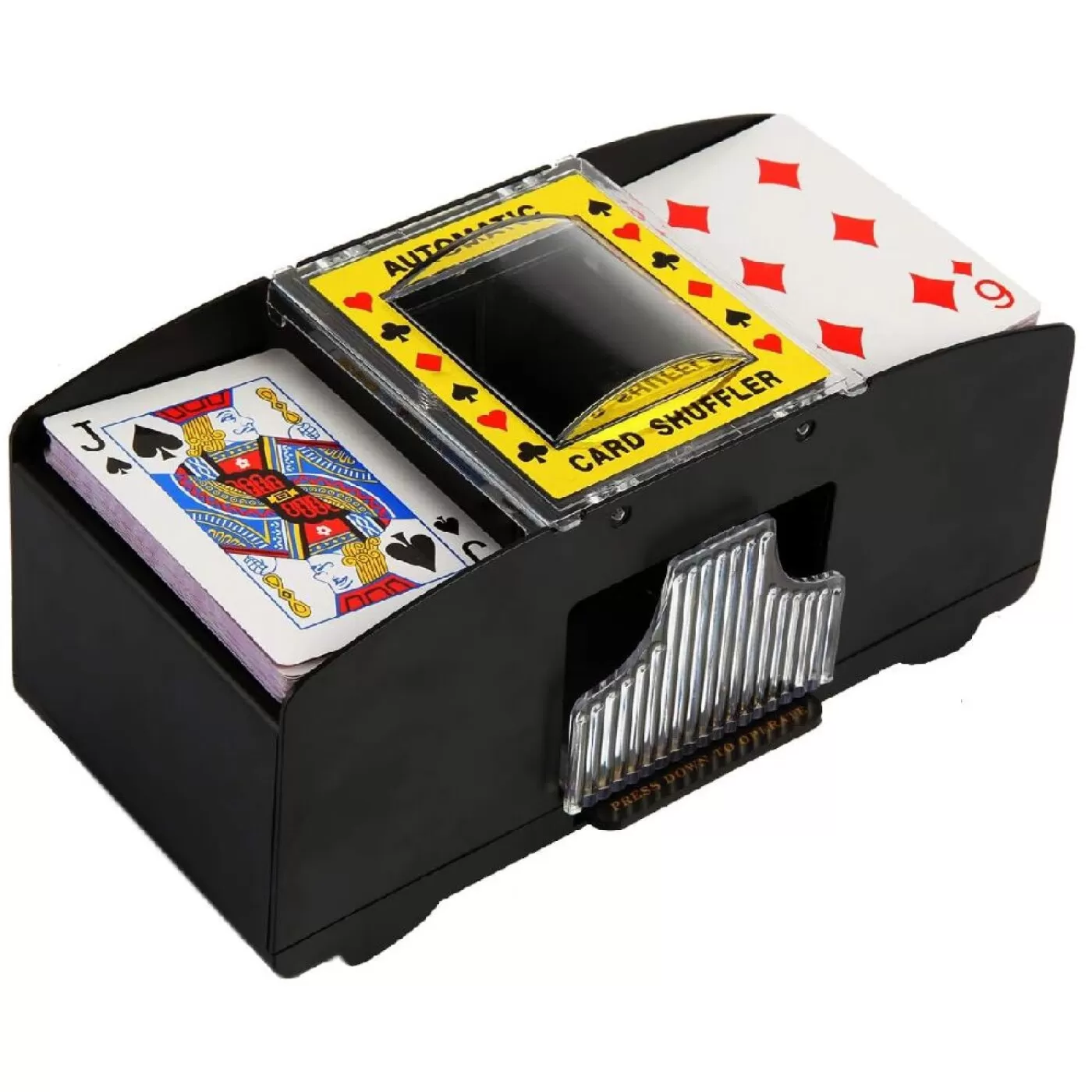 O embaralhador de cartas automático é prático e ideal para profissionalizar o seu jogo, pois ele embaralha até 2 jogos de baralho de forma rápida e eficiente. Ele embaralha em poucos segundos, dando mais agilidade para seu jogo. Também proporciona durabilidade, pois evita amassar e sujas as suas cartas. Pode ser utilizado por qualquer tipo de baralho, tanto papel quanto de plástico, em tamanho padrão. Ele possui um Botão de acionamento para dar inicio ao processo e uma gaveta para retirar as cartas da máquina quando estiverem embaralhadas.