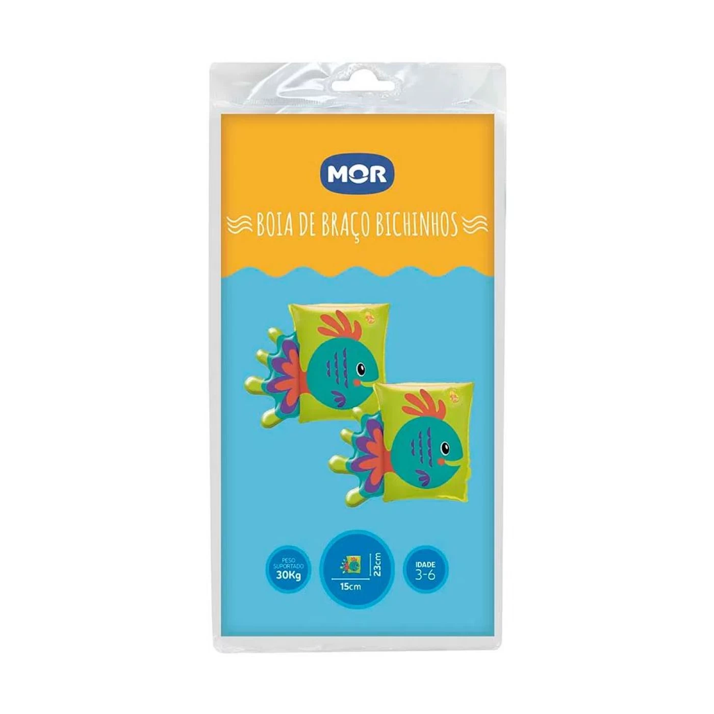 om estampa de peixinho, as Boias de Braço Bichinho da Mor possuem quatro diferentes opções de cores predominantes: Azul, Amarelo, Rosa e Verde. Possuem duas câmaras de ar independentes, o que dá mais segurança para os pequenos, pois em caso de furo ou esvaziamento acidental de uma delas a outra câmara garante sua estabilidade na água. Recomendadas para crianças entre 3 e 6 anos, possuem duas válvulas de segurança e acompanham kit para reparo. Atenção! Este não é um equipamento salva-vidas. Nunca deixe crianças sozinhas perto da água sem supervisão de um adulto.