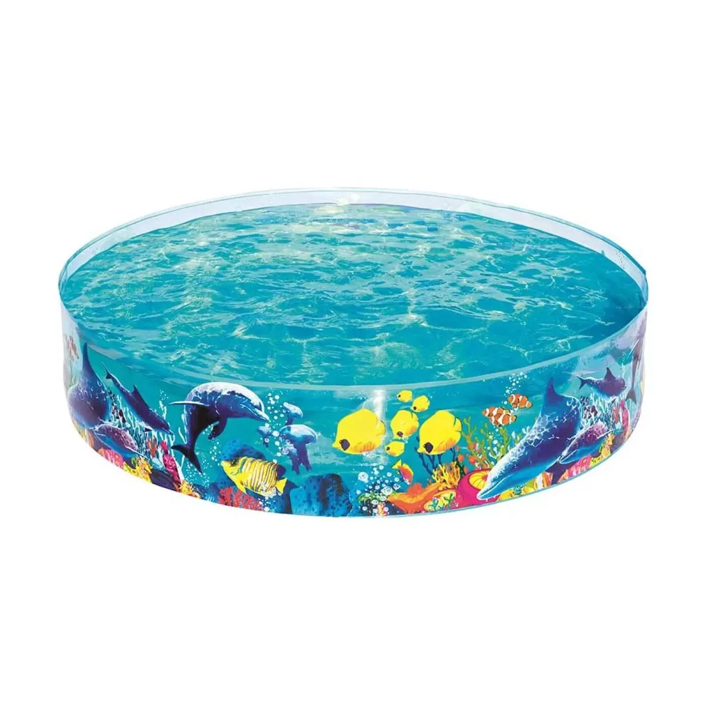 Ela é um modelo de inflar muito prático, que possui as paredes laterais em PVC rígido de alta resistência permanentemente fixo ao fundo da piscina, que é fabricado em vinil resistente.