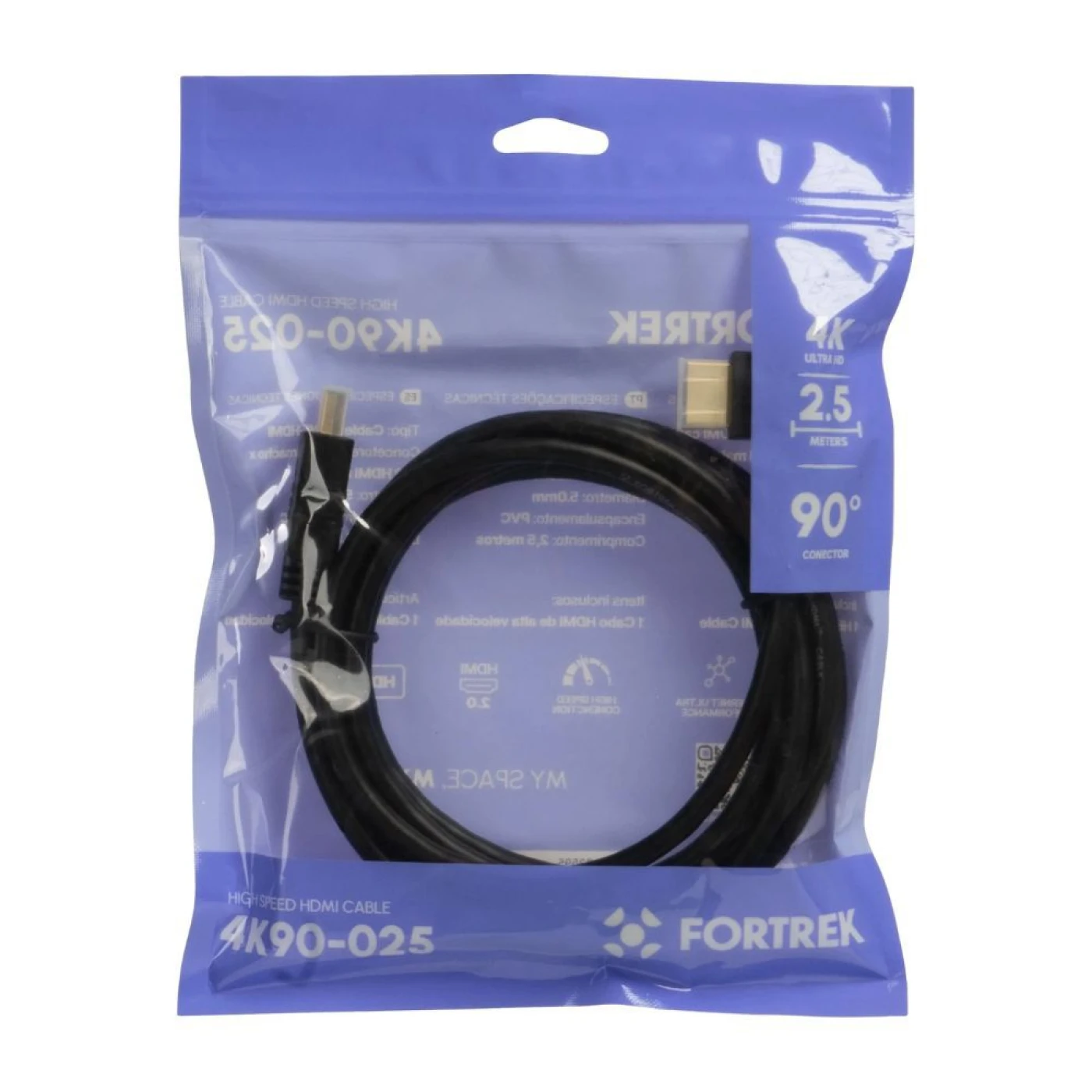 O Cabo HDMI Fortrek 4K90-025 oferece alta performance e qualidade para transmissão de áudio e vídeo em alta definição. Com 2,5 metros de comprimento e conectores em ângulo de 90 graus, é ideal para instalações em espaços reduzidos ou equipamentos próximos à parede. Compatível com a versão HDMI 2.0, suporta resolução 4K a 60Hz, 3D, HDR e canais de áudio aprimorados, proporcionando uma experiência visual e sonora superior.
