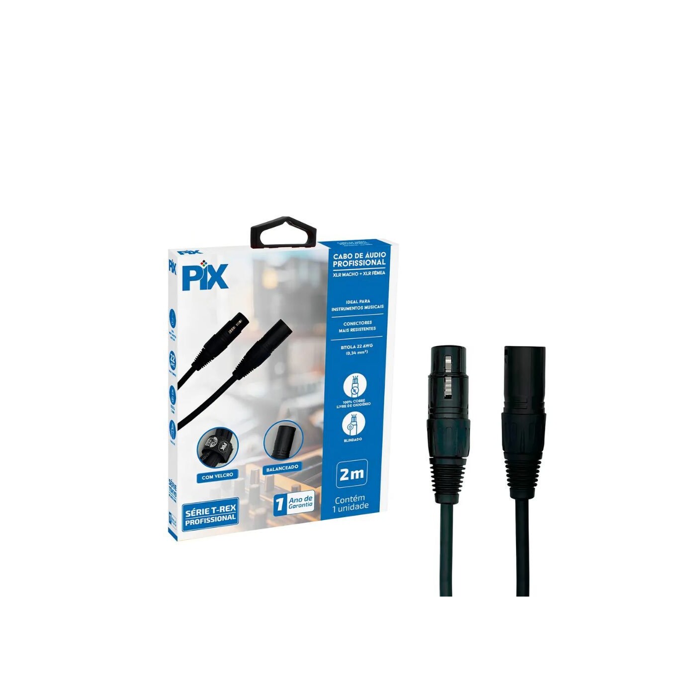 Cabo de áudio profissional com 2 metros de comprimento, ideal para conexão de equipamentos de som como microfones, mesas de som e interfaces de áudio. Conectores XLR de alta qualidade garantem transmissão de sinal estável e sem interferências. Produto da marca Pix, modelo TR-MW2, fabricado com materiais duráveis e blindagem contra ruídos.