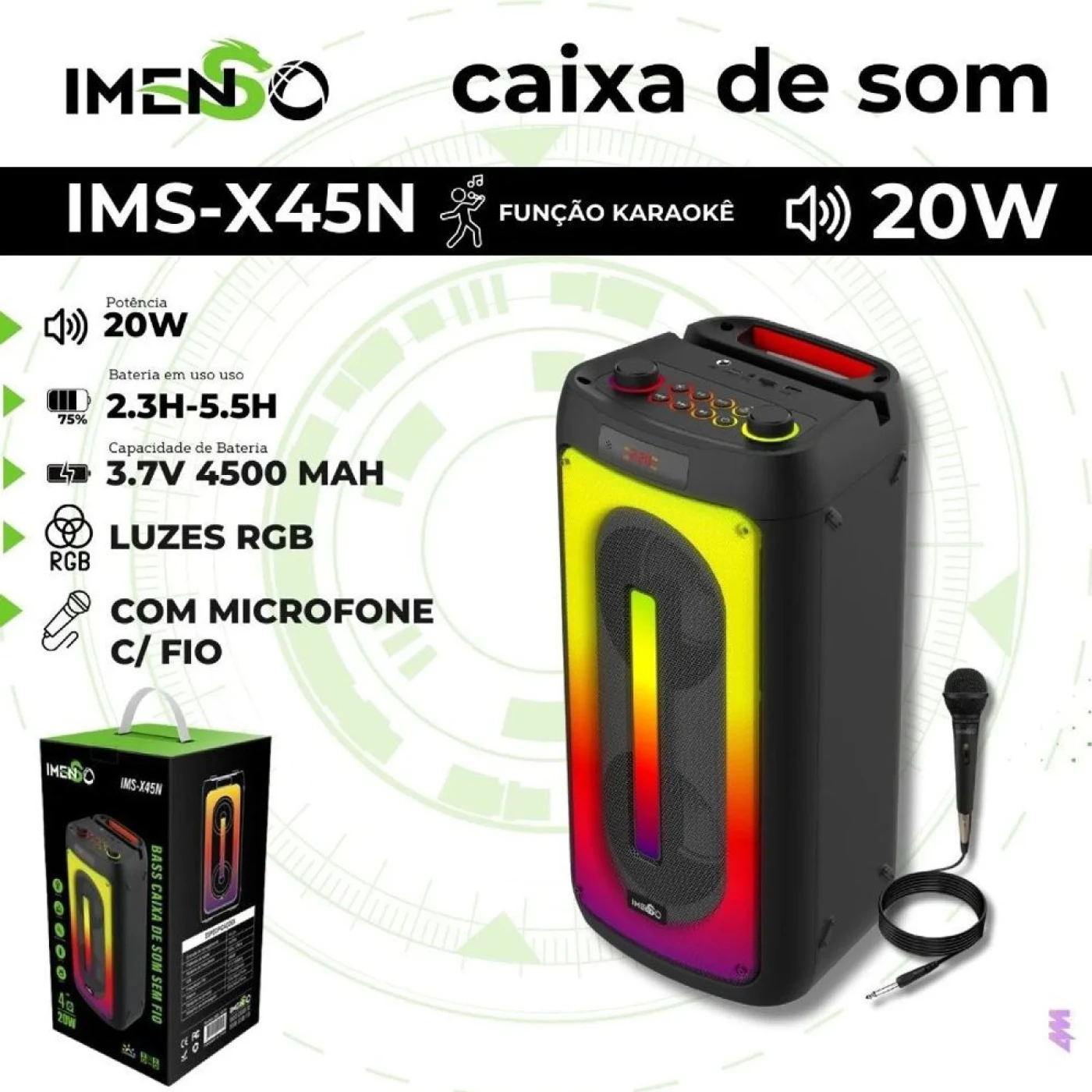 A Caixa de Som Portátil Preta IMS-X45N Imenso é a escolha perfeita para quem busca potência, praticidade e qualidade sonora em um único produto. Compacta e elegante, com acabamento preto sofisticado, essa caixa de som é ideal para qualquer ocasião, seja em casa, no trabalho, no lazer ou em eventos ao ar livre.