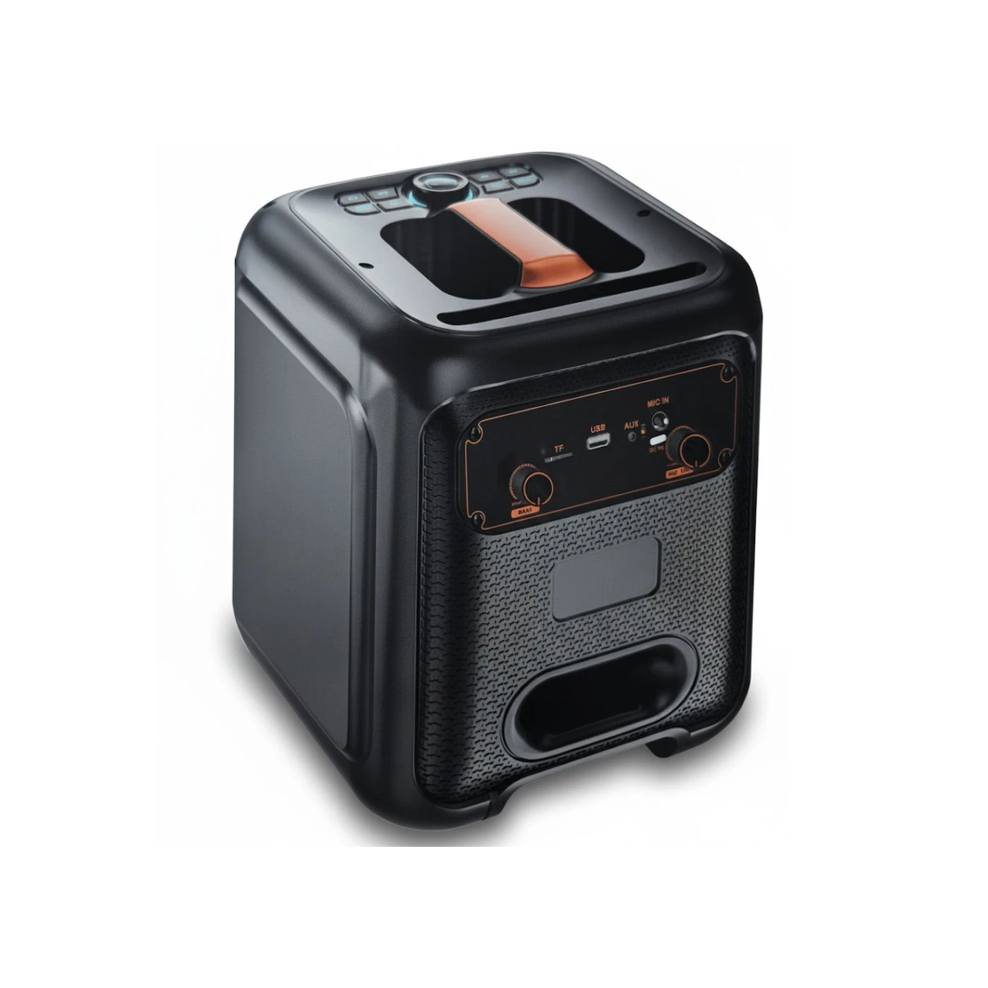 O modelo conta com bateria recarregável de longa duração, permitindo horas de uso contínuo, além de alça que facilita o transporte. Seus alto-falantes oferecem graves reforçados e som limpo, tornando-se uma excelente escolha para festas, viagens, reuniões e uso doméstico.