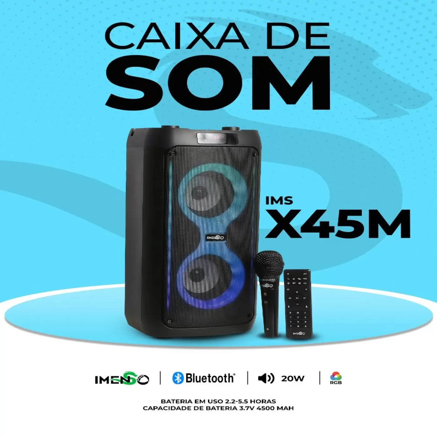 O novo IMS-X45M da IMENSO é o companheiro perfeito para suas festas de karaokê! Com 20W de potência, luzes RGB vibrantes e bateria de longa duração de 4500 MAH, você terá até 5.5 horas de diversão ininterrupta.