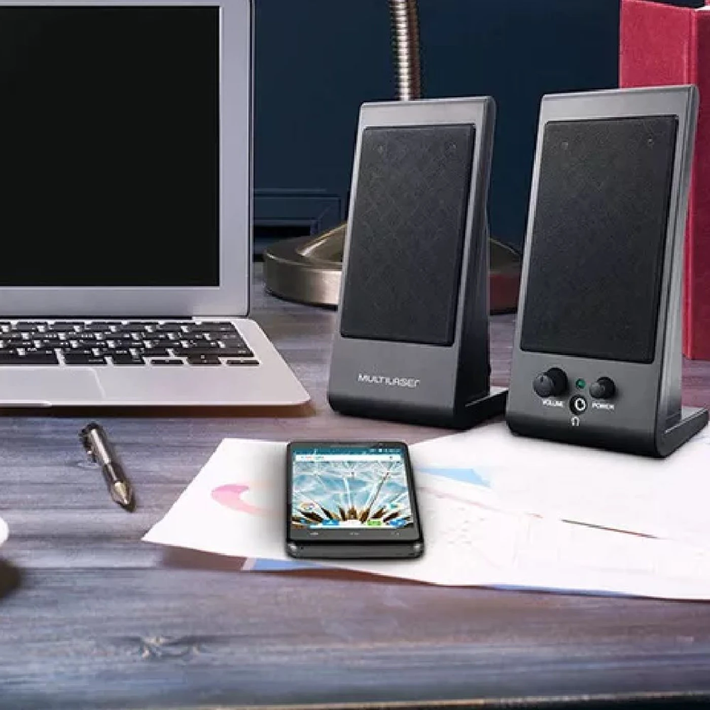 Com tecnologia de conexão Plug e Play, conecte a entrada P2 de áudio e USB de energia, e comece a usar. A caixa de som possui 3W Rms de potência, design estéreo, além de controle de volume.