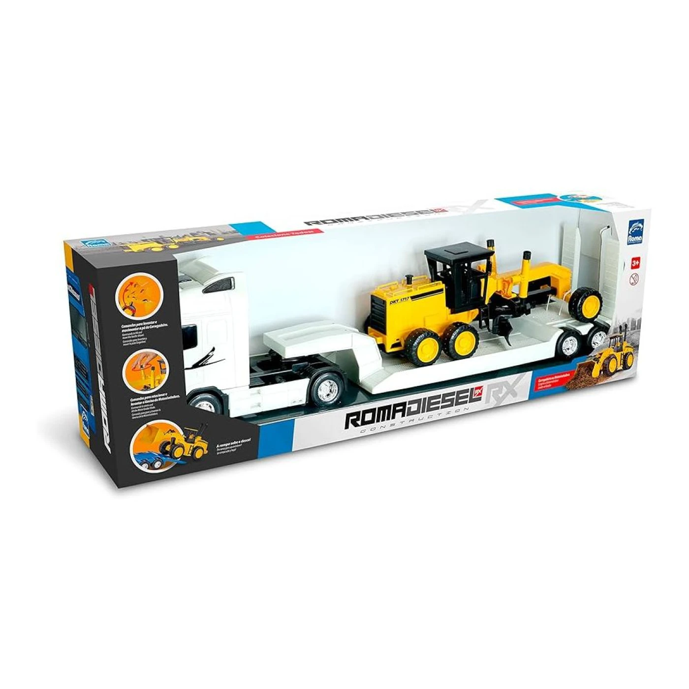 O Roma Diesel Motoniveladora é uma carreta super potente que acompanha uma Motoniveladora que possui comando dinâmicos para movimentar a altura e a rotação da lâmina em duas posições.