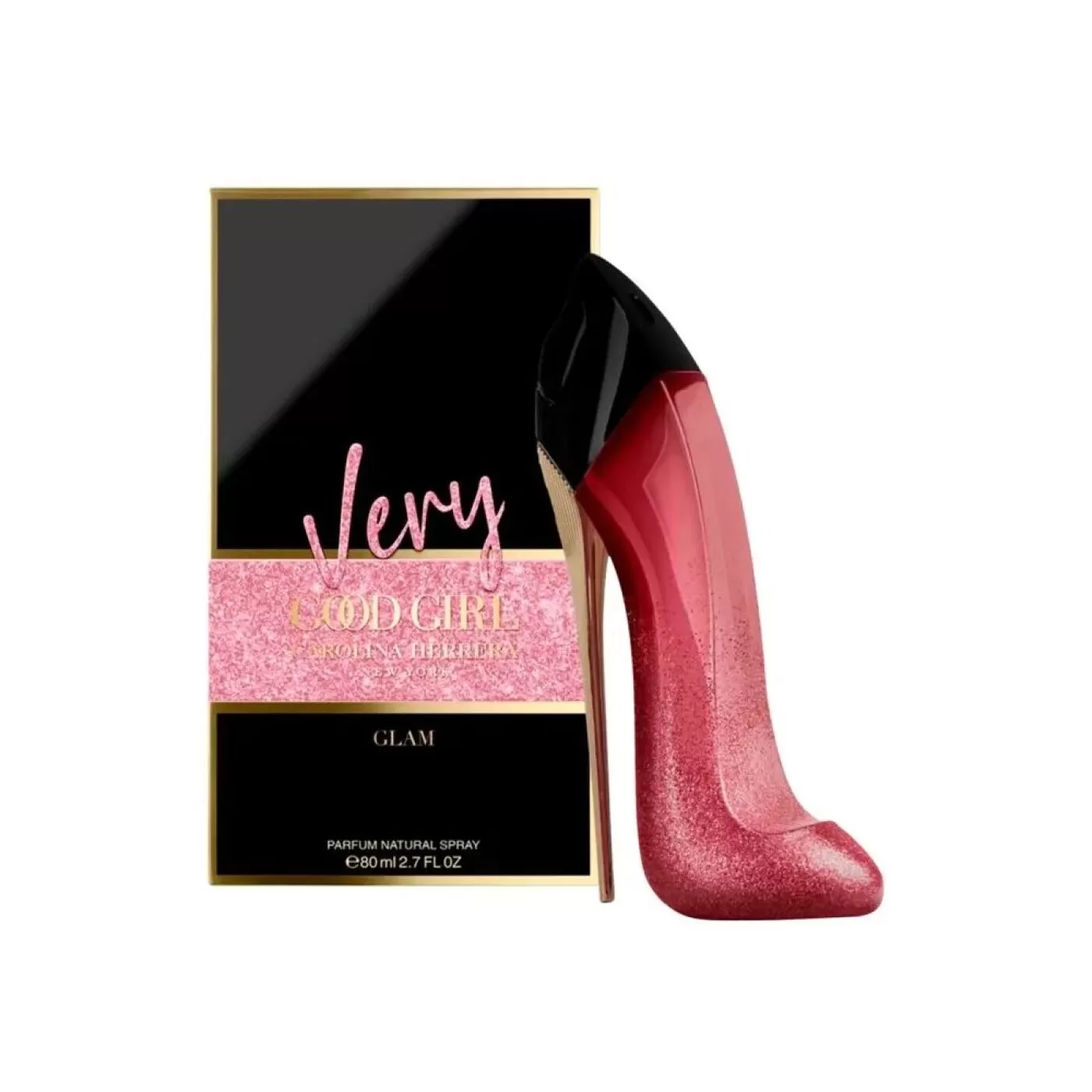 O Very Good Girl Glam Parfum eleva o icônico frasco Good Girl com seu salto-agulha vermelho-cereja brilhante com uma cascata de glitter deslumbrante, uma expressão espetacular de feminilidade.