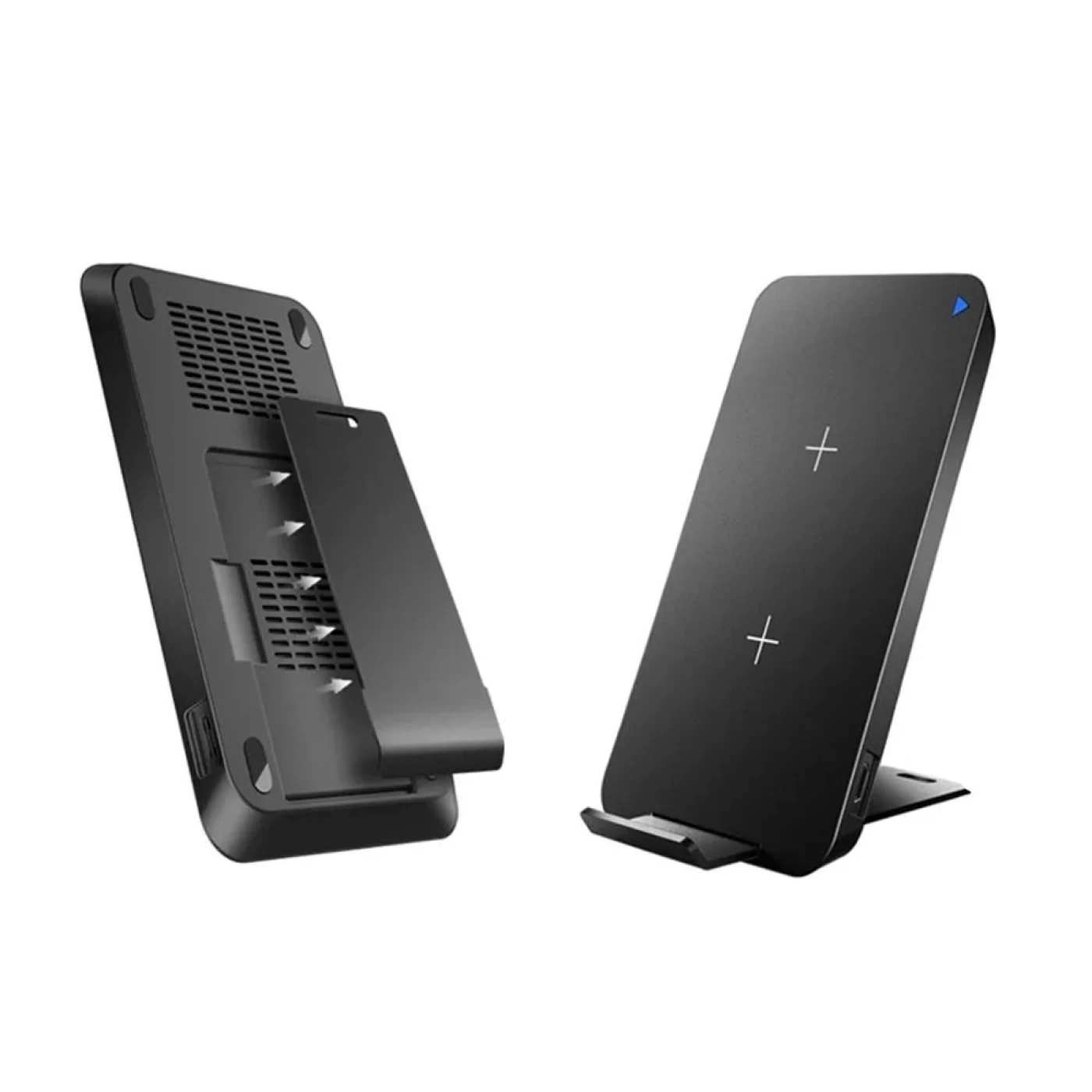Design 2 em 1: Suporte integrado que permite usar o smartphone na posição vertical ou horizontal durante o carregamento.