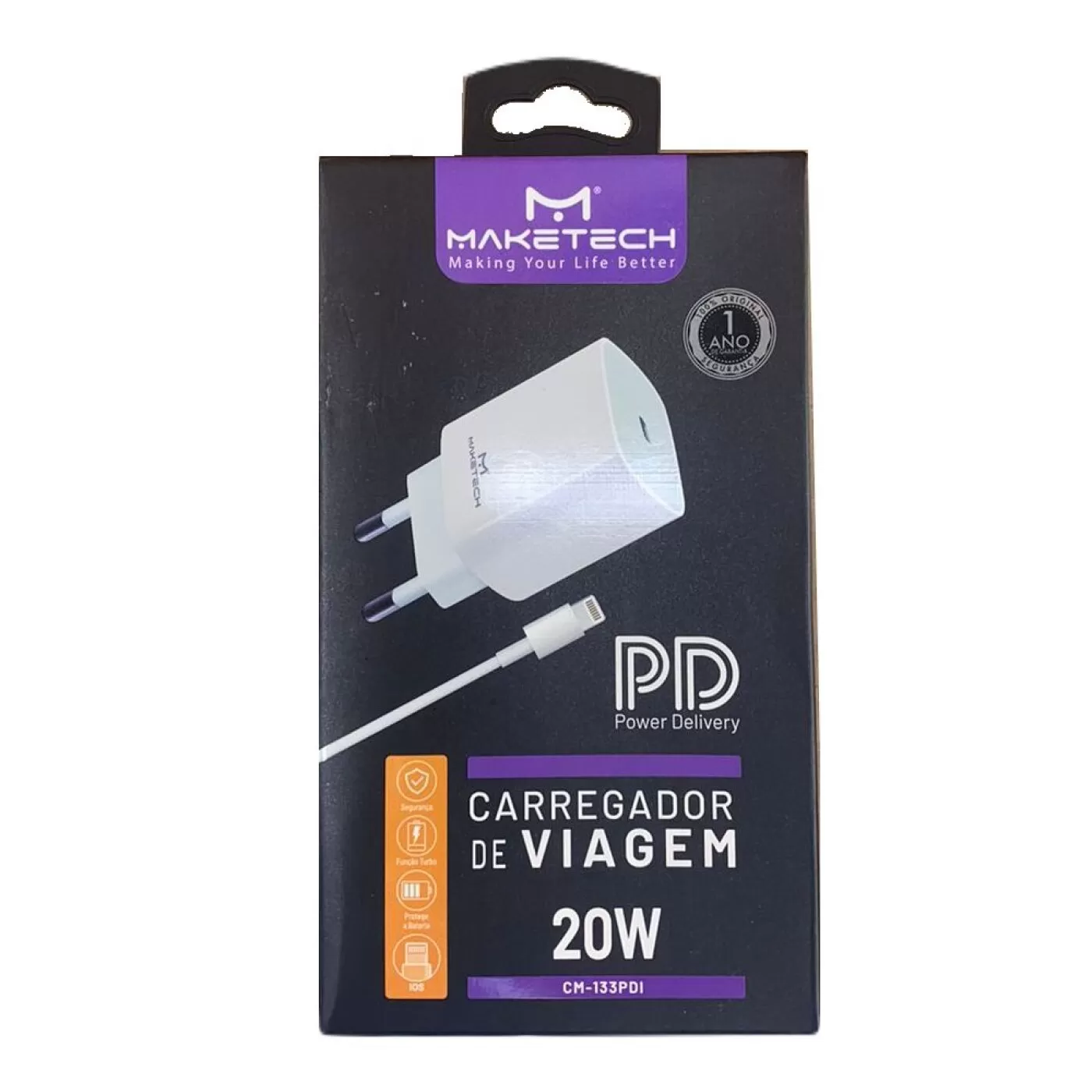 O carregador de viagem Lightning 20W CM-133PDI da MAKET é uma excelente opção para quem busca praticidade e eficiência na hora de carregar dispositivos eletrônicos. Com uma potência de 20W, ele permite carregar seu iPhone ou iPad de forma rápida e segura, evitando danos à bateria do aparelho.