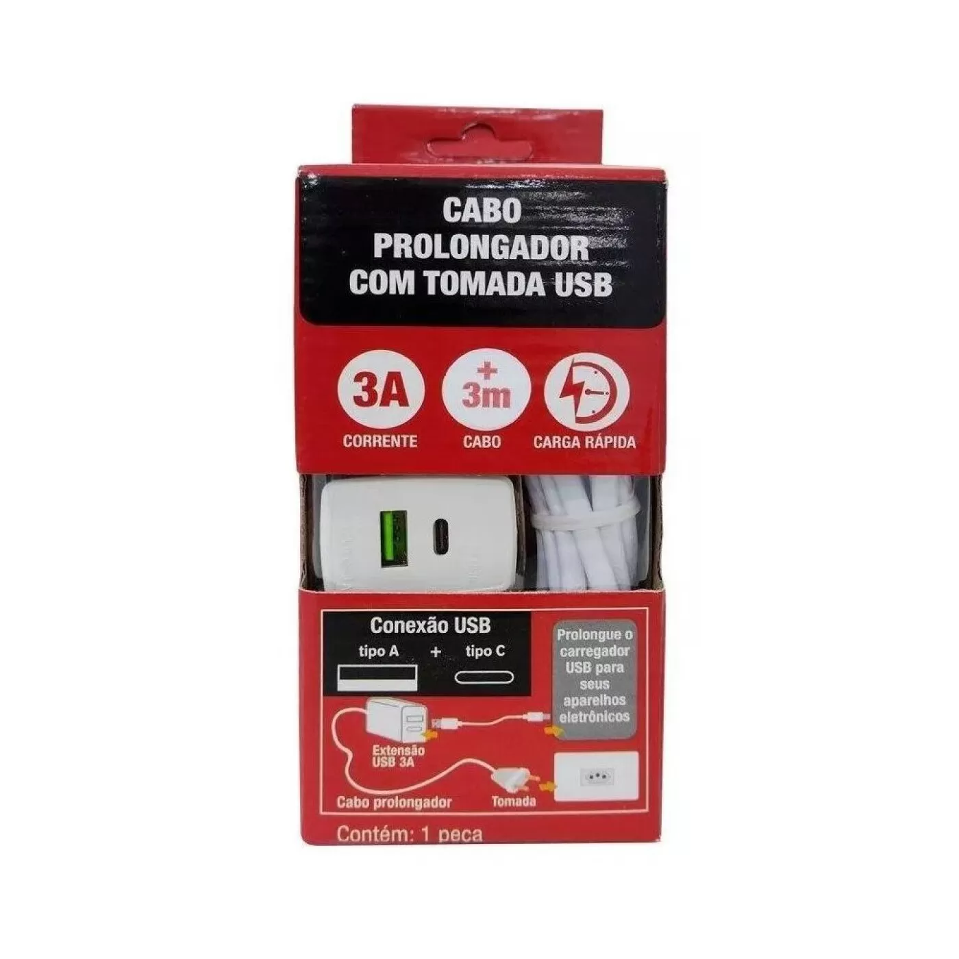 Extensão Cabo Prolongador Tomada Usb A+C 3A 3m - Force Line