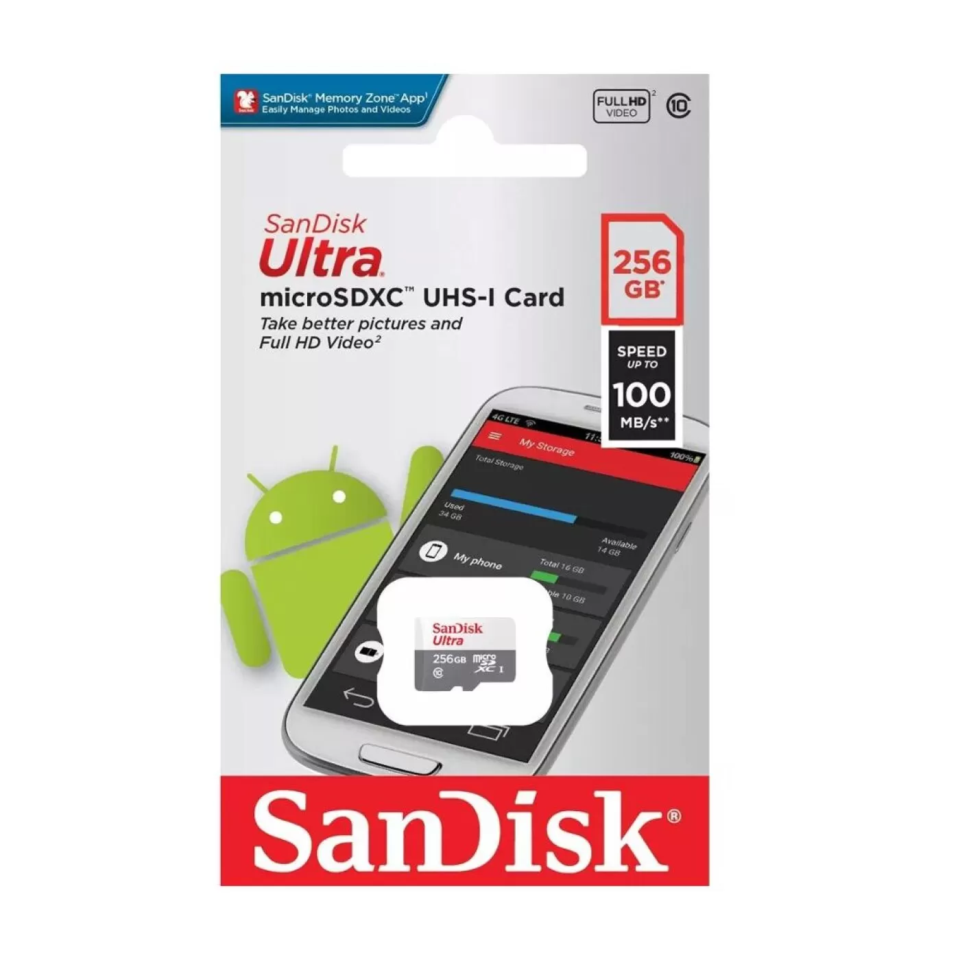 Enfrentando falta de espaço ou lentidão em seus dispositivos? O Cartão SanDisk Ultra® 256GB soluciona esses problemas, proporcionando alta velocidade e grande capacidade de armazenamento. Adquira agora e dê um upgrade em seu smartphone, tablet, câmera, ou drone!