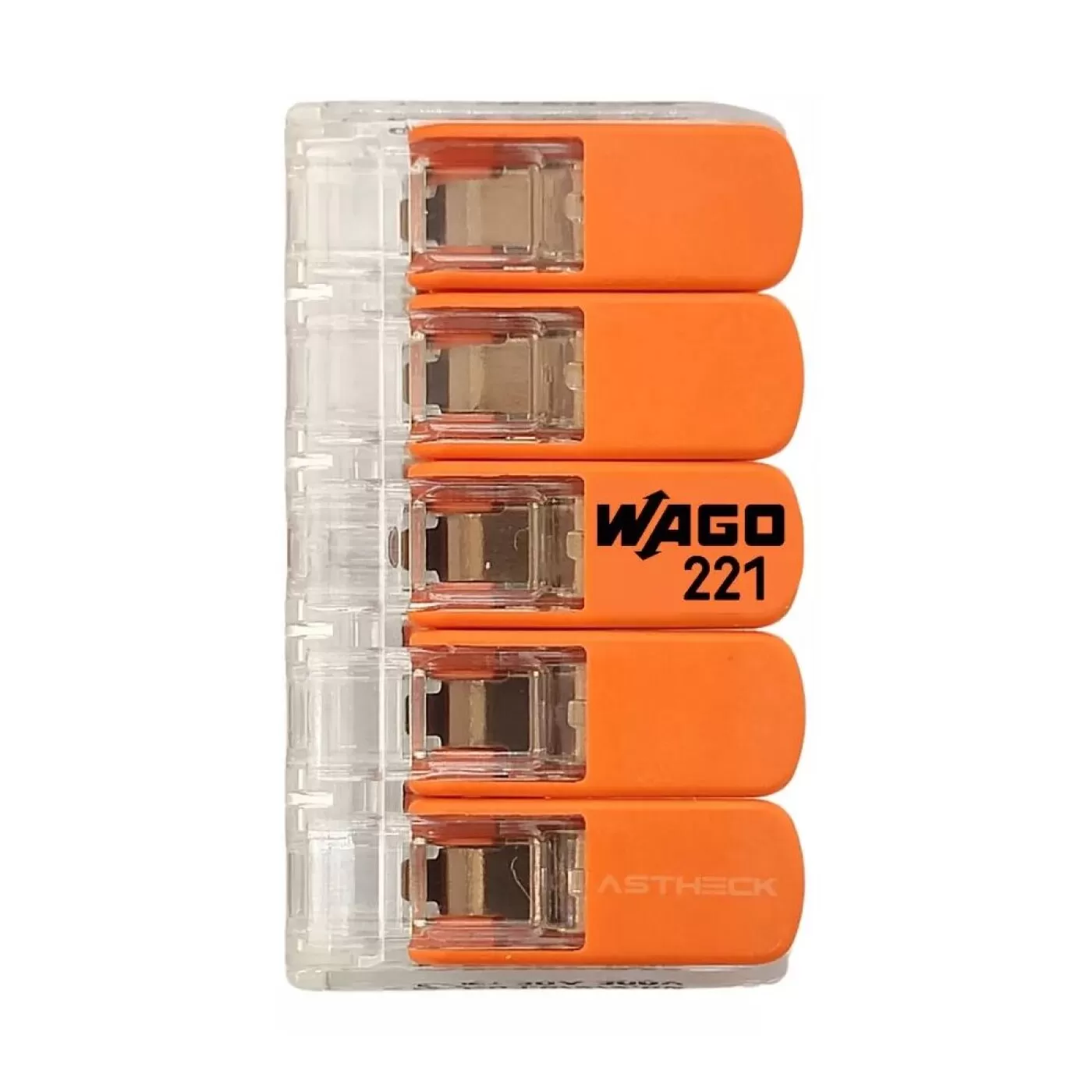 Conector de emenda; para condutores de até 4mm² com 5 entradas. Produto transparente e com alavancas laranjas. Temperatura máx. de operação 105ºC.