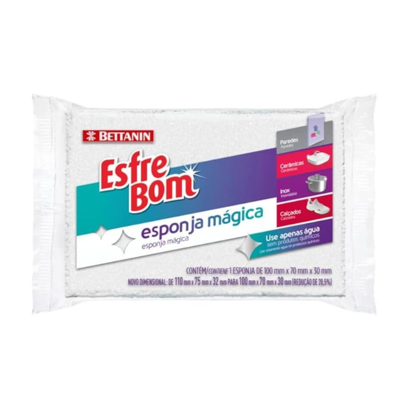 A Esponja Mágica Esfrebom é ideal para a remoção de manchas difíceis sem a necessidade de produtos químicos. Basta umedecer com água e esfregar suavemente para eliminar sujeiras de paredes, portas, pisos, tênis, eletrodomésticos e muito mais.
