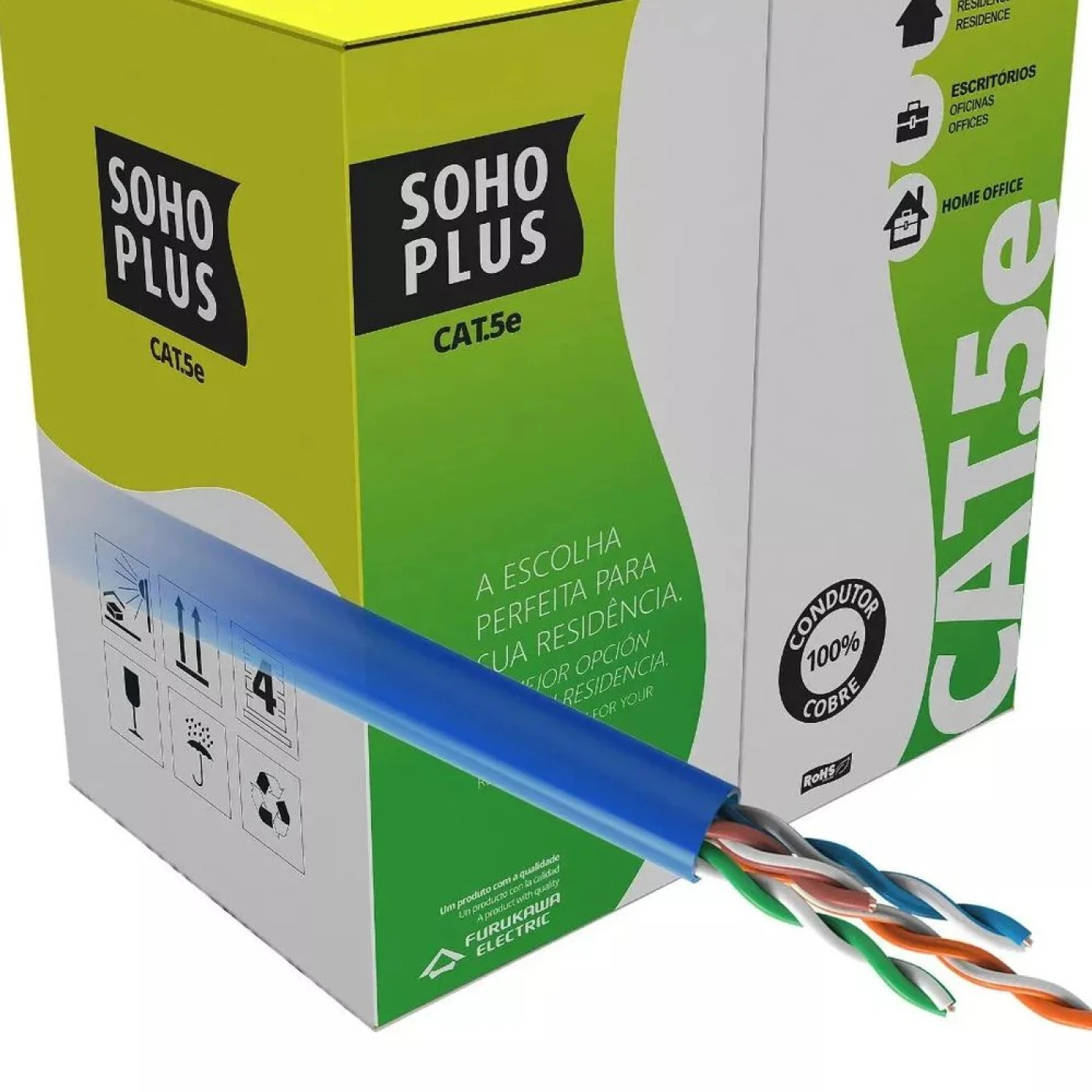 - Construção: U/UTP – 4 pares trançados compostos de condutores sólidos de cobre nu, 24 AWG, isolados em polietileno especial