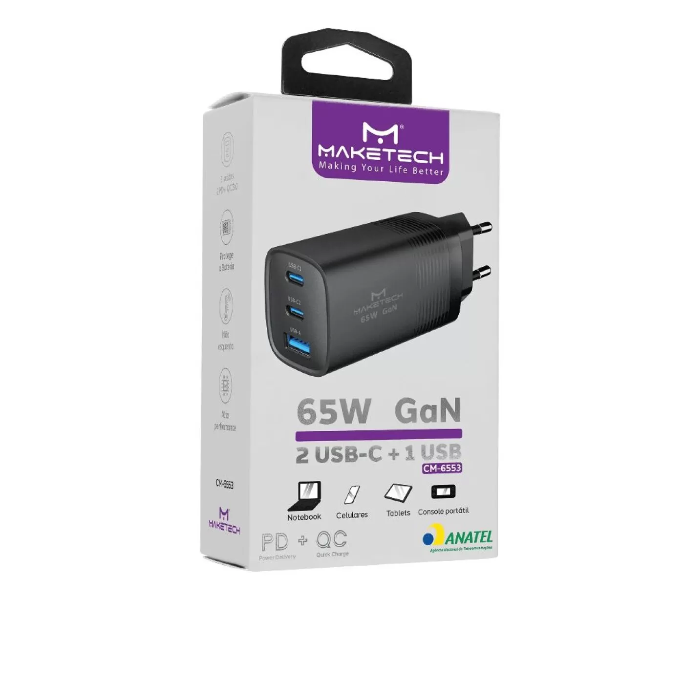 Uma das características mais notáveis deste carregador é sua potência de 65W, o que significa que pode carregar seus dispositivos rapidamente, reduzindo o tempo necessário para recarregar baterias e garantindo que você possa voltar a utilizar seus dispositivos em pouco tempo.