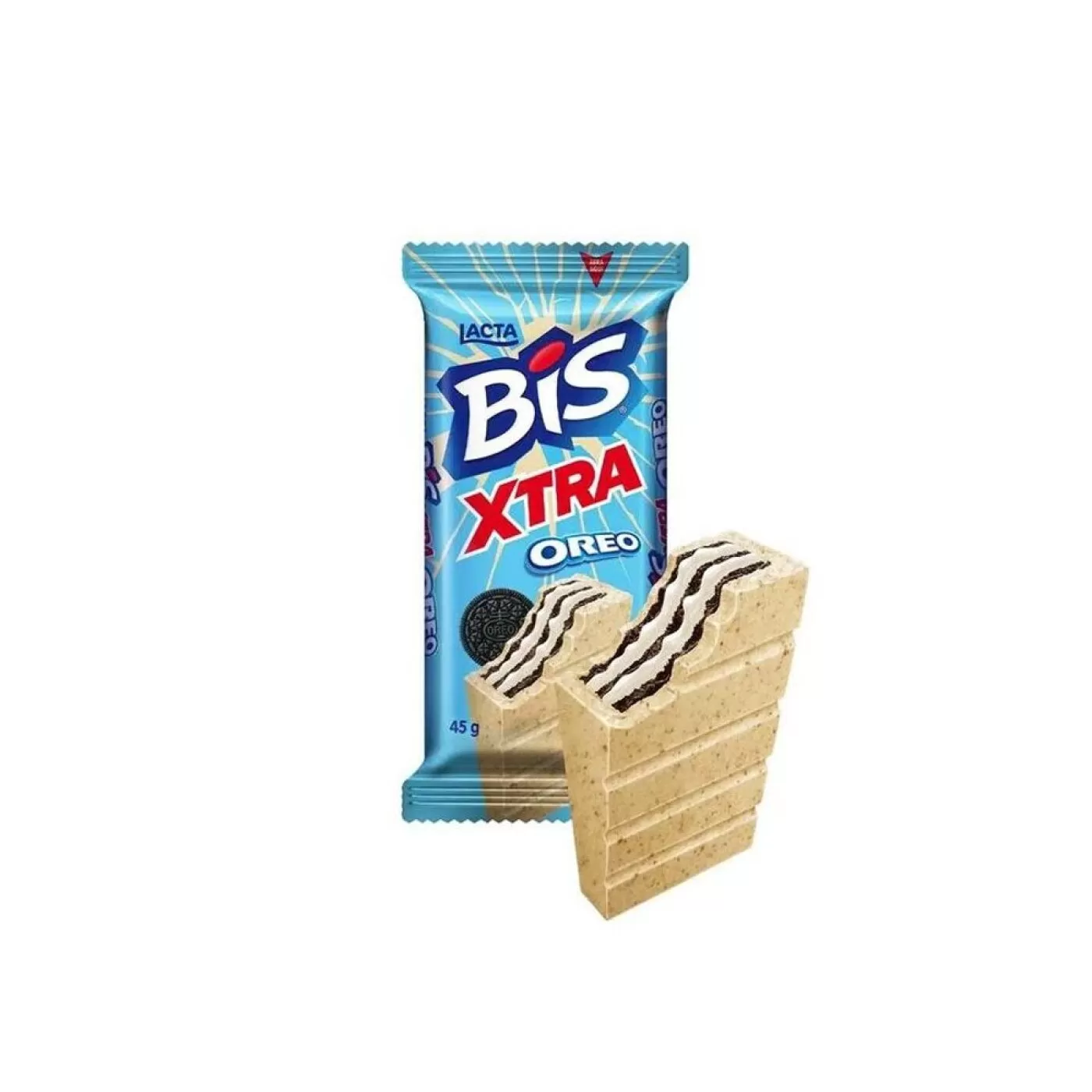 O Bis já é bom, mas com chocolate extra e pedacinhos de cookie Oreo é melhor ainda! Bis Xtra Oreo é a combinação perfeita do famoso wafer crocante de Bis, com o delicioso chocolate ao leite Lacta e pedacinhos de cookies Oreo. Uma explosão de sabores em uma embalagem de 45g, perfeita para ter na mochila, na gaveta do escritório ou na despensa de casa, para quando bater aquele descontrole por doce!