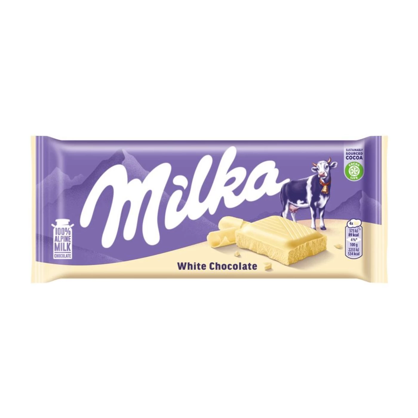 Barrinha de chocolate branco 100% alpino. Delicioso chocolate de origem européia, uma das diversas opções de sabores que a linha Milka oferece!