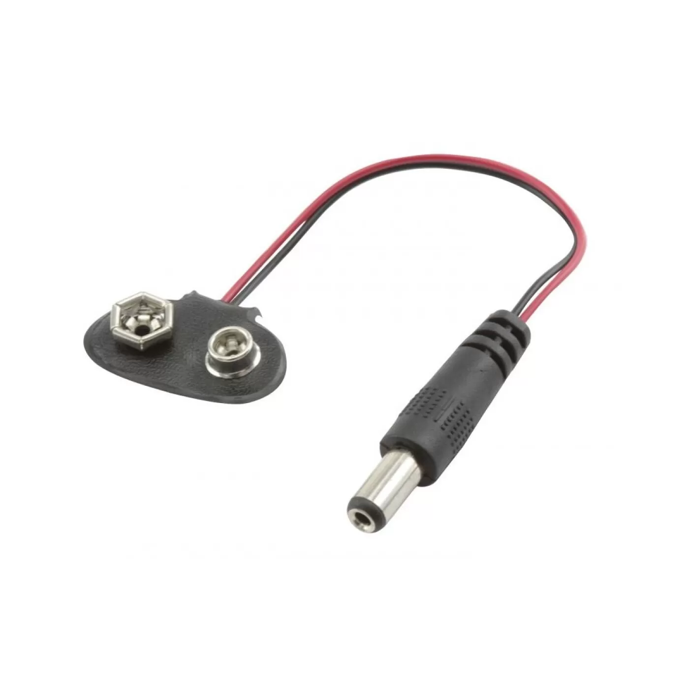 - Este Conector de Bateria conta em uma de suas extremidades com um conector ( clip ) para ligação com a bateria 9V e na outra com um plug P4 para conexão com o Arduino, por exemplo.