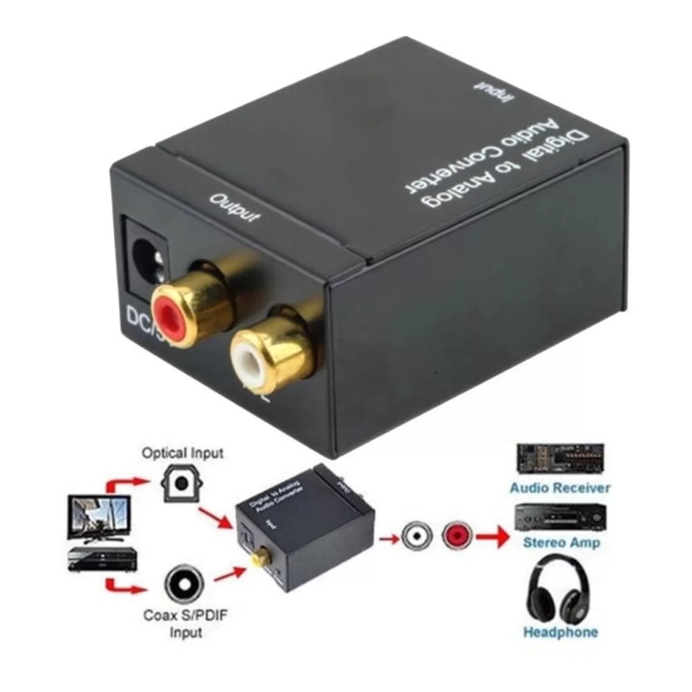 ou profissional. Ele converte sinais de áudio digidal coaxial ou óptico toslink em áudio analógico através