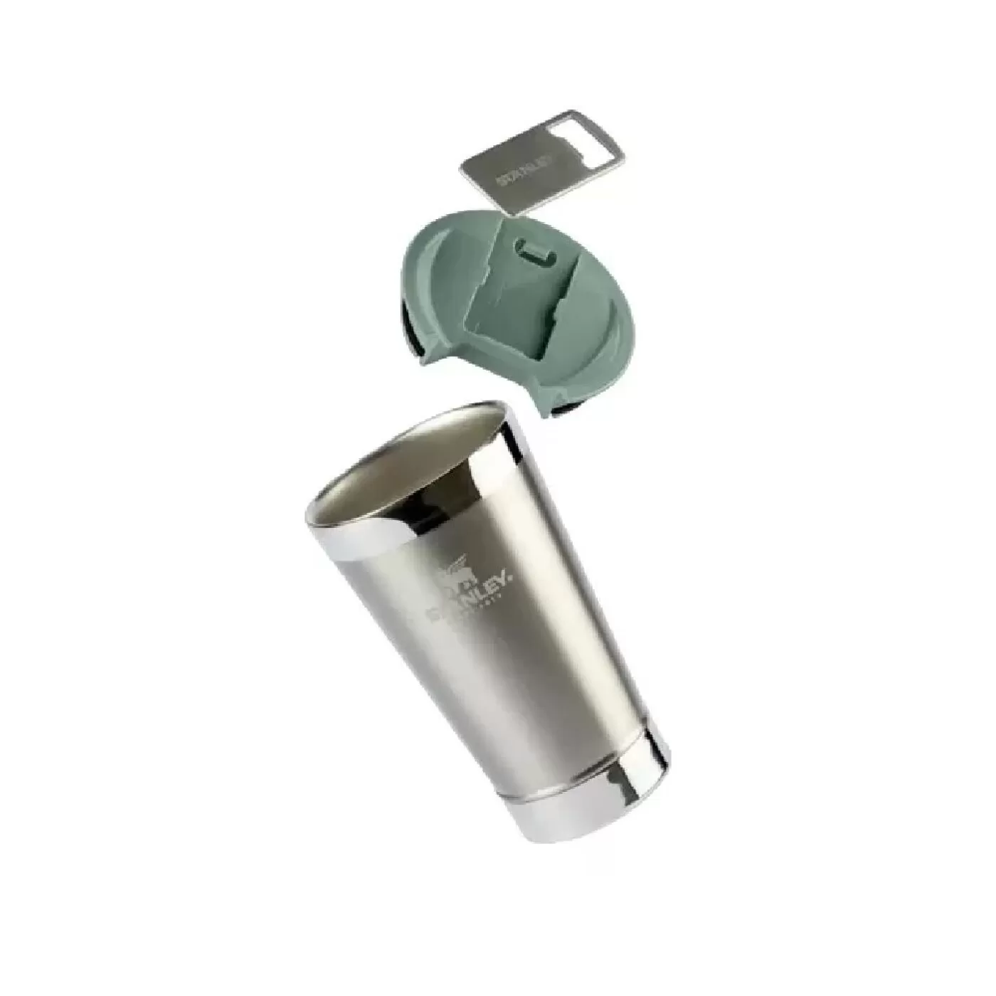 Para criar uma experiência completa, o copo térmico de cerveja da Stanley possui uma tampa contra derramamento e sujeiras, com um abridor de garrafas acoplado.