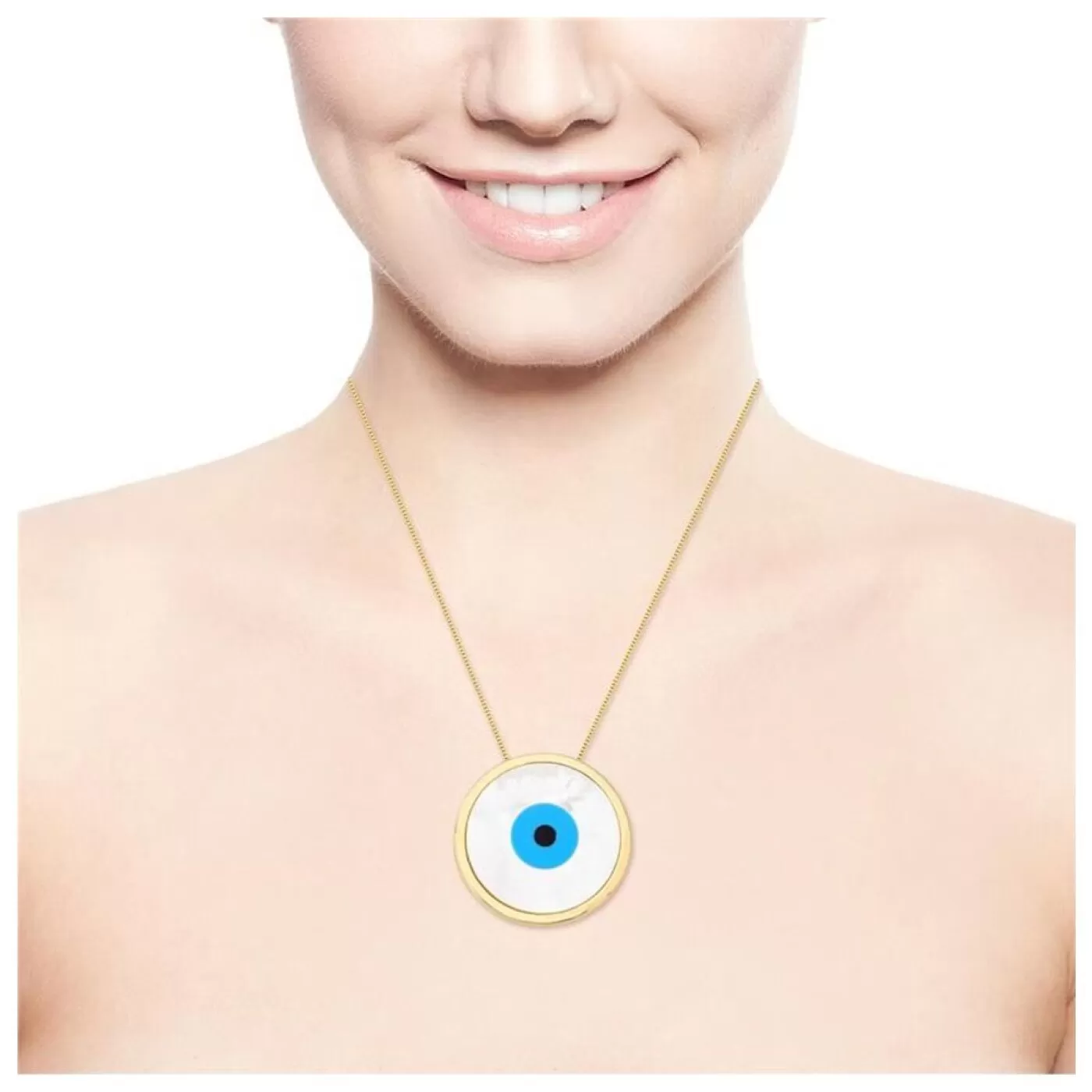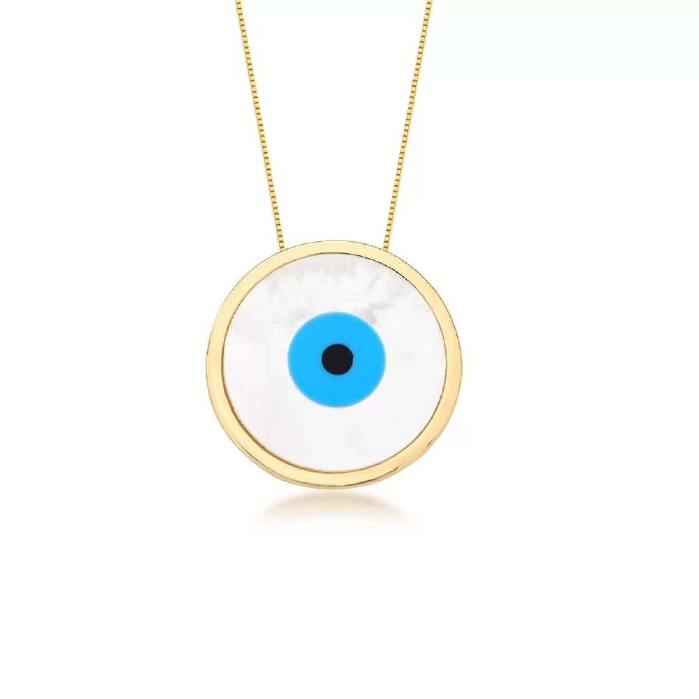 Colar em malha veneziana, com pingente de olho grego redondo em madrepérola banhado a ouro.