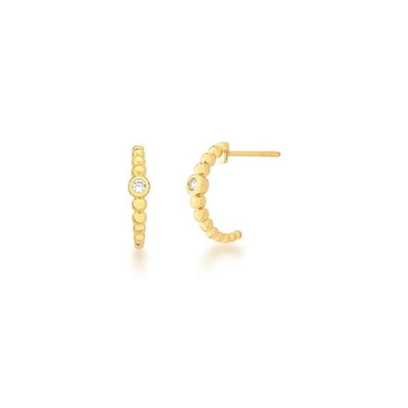 Brinco curvo com granulações lisas e ponto de luz banhado a ouro.