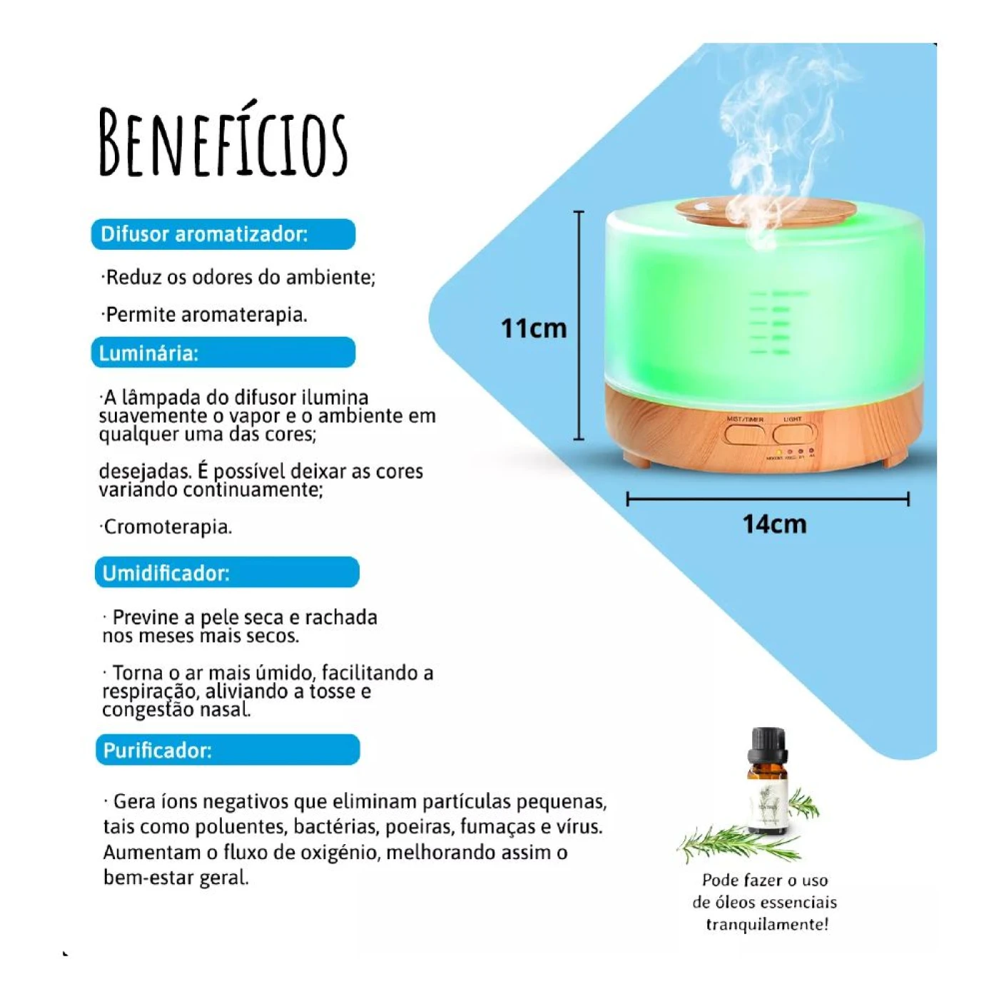 Possui uma nevoa eficiente e silenciosa, pode ser um excelente auxiliar para quem possui asma ou problemas respiratórios. O Aromatizador Difusor com luz pode ser preenchido 500ml a luz pode ser usada como abajur ou decoração de ambiente.