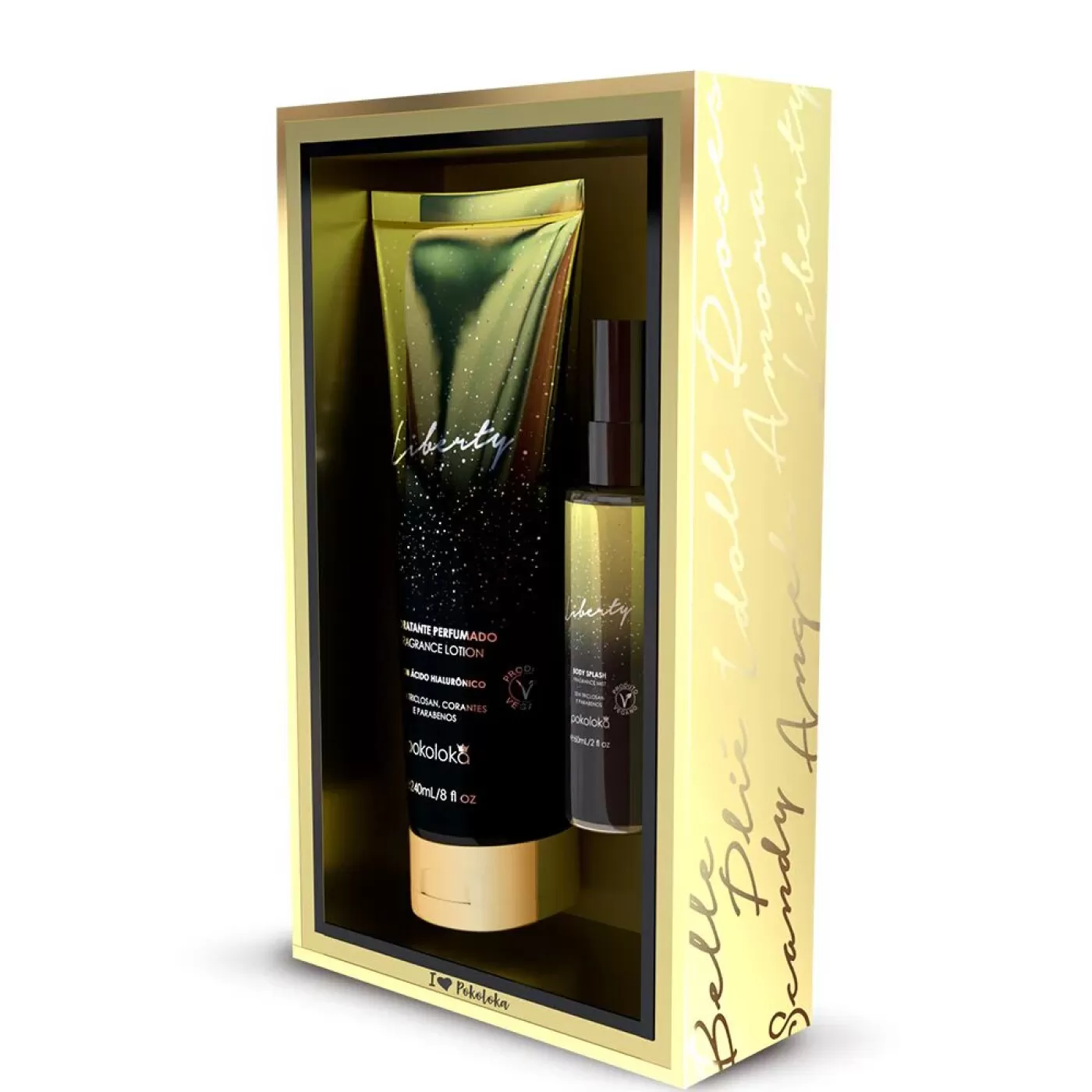 A Pokoloka, sempre atenta aos desejos de nossas clientes, tem o prazer de anunciar o lançamento do Kit LokaGold. Este conjunto exclusivo contém um Hidratante Perfumado de 240ml e um Body Splash de 60ml, ambos na mesma fragrância.