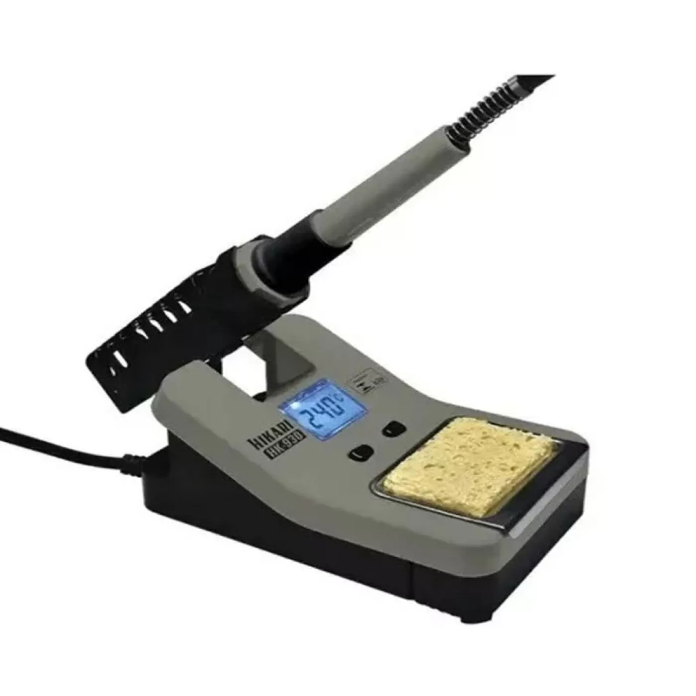 Estação de Solda Digital Modelo HK-930 é ideal para remoção e soldagem de componentes PTH e SMD, com faixa de temperatura ajustável entre 160°C e 520°C (±10°C). Conta com controle digital de temperatura e display LCD iluminado para melhor visualização. Seu design é compacto e de fácil manuseio, proporcionando aquecimento rápido e ajuste preciso da temperatura. Inclui uma mini gaveta na base para armazenamento de componentes e suporte integrado para o ferro de soldar.